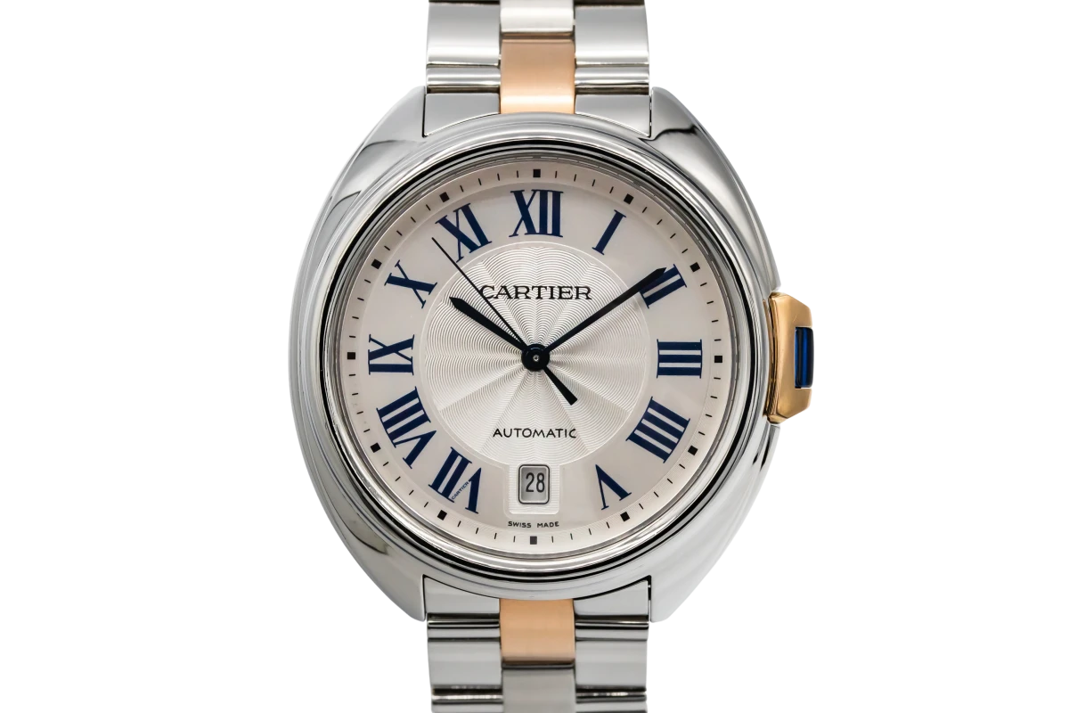 This 2015 Cartier Cle De Cartier 40mm features a white dial with roman numerals and a stainless steel and 18ct rose gold bracelet. It also features a smooth stainless steel bezel.