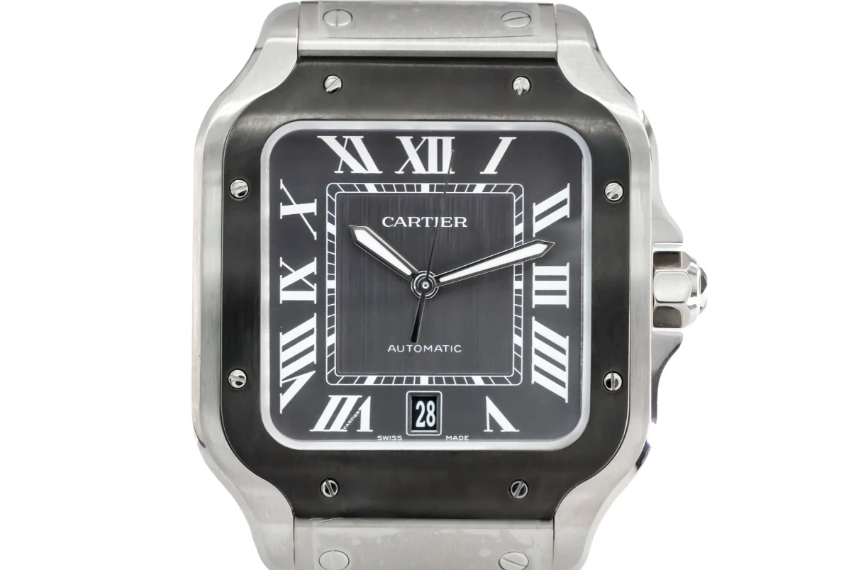 This 2022 Unworn Cartier De Santos Features A 40mm Grey Roman Numeral Dial, A Stainless Steel Bracelet And A Stainless Steel Bezel.