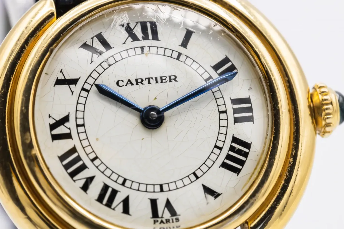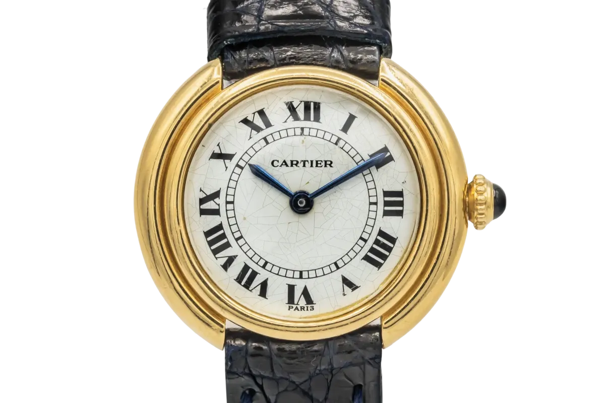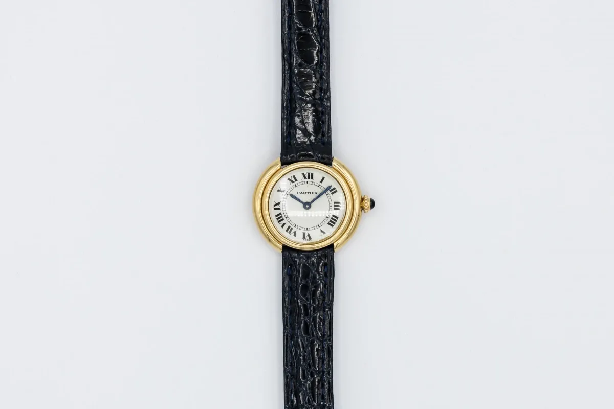 finance this from £57.79 p/m call the shop Read about our Limited Lifetime WarrantyThis circa 1970's Cartier Ellipse Vintage 24mm features an off-white dial featuring black printed Roman numeral hour indices with inner minute track and blued steel sword shaped hands. It is fitted in an black leather strap with an 18ct yellow gold deployant buckle.