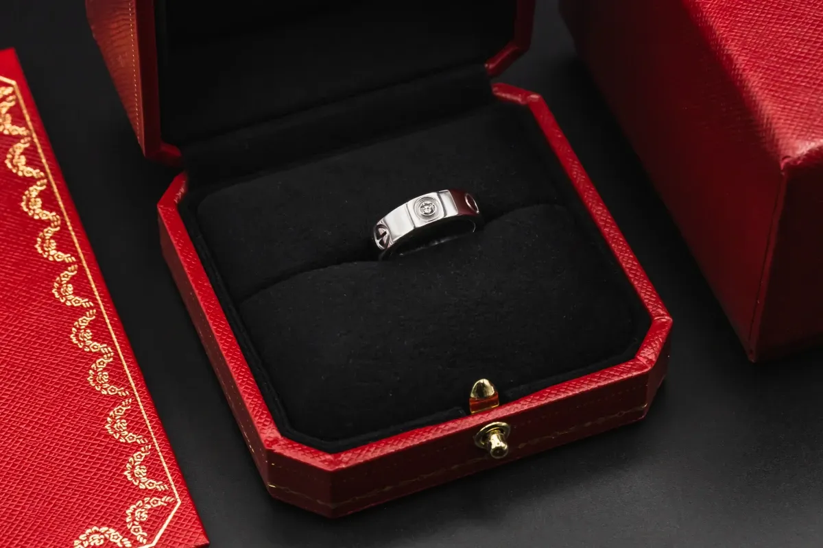 The signature screw motifs, a hallmark of the LOVE collection, represent commitment and unity. With a 5.5mm width and a sleek, polished finish, this ring embodies timeless sophistication. A true statement piece, it remains one of Cartier’s most sought-after designs, cherished for its rich history and romantic symbolism.