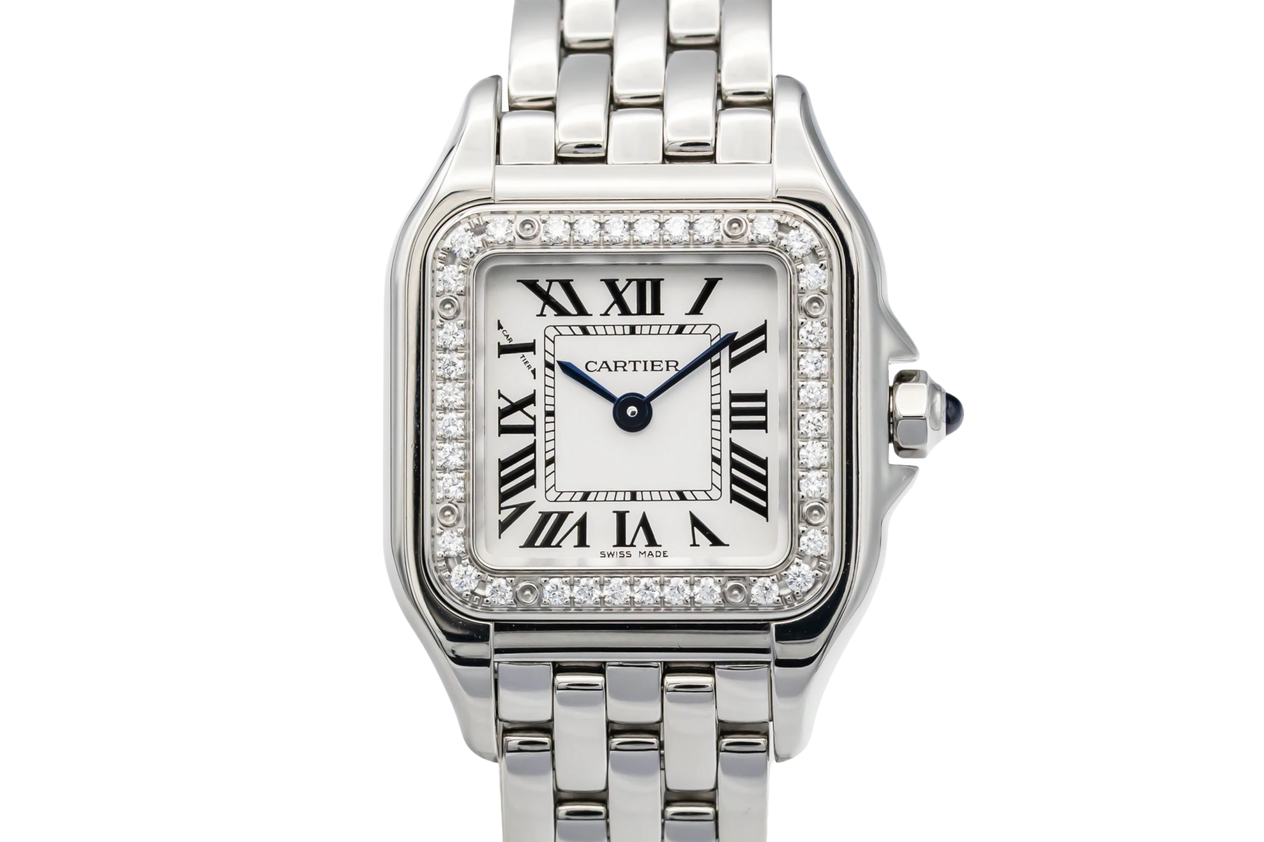 This circa 2020 Cartier Panthère 22mm features a refined stainless steel case highlighted by a factory diamond-set bezel, adding a luxurious sparkle to the watch’s iconic silhouette. Its polished 22mm case is paired with a silvered dial, complete with bold black Roman numerals and blued-steel sword hands for unmistakable Cartier elegance.