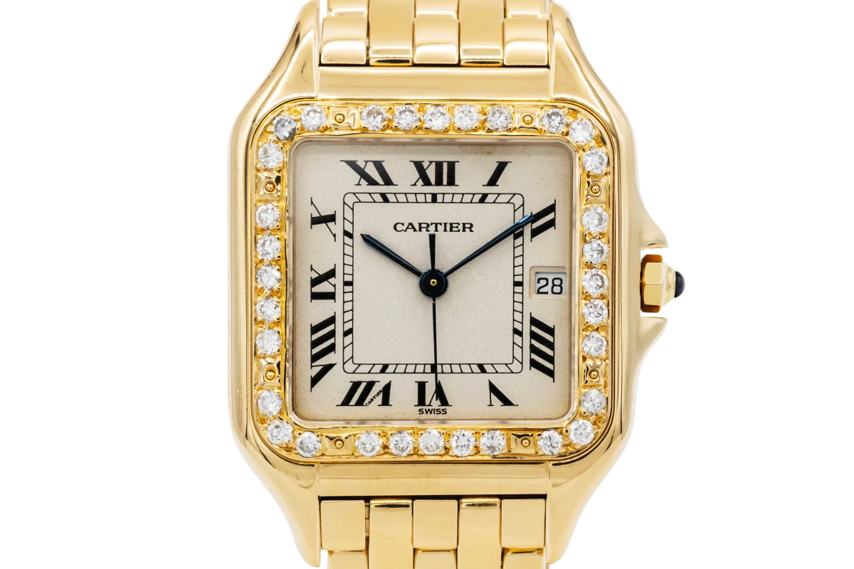 This Circa 1990s Cartier Panthere 29mm features a white roman numeral dial and a 18ct yellow gold bracelet. It also features a custum diamond bezel.