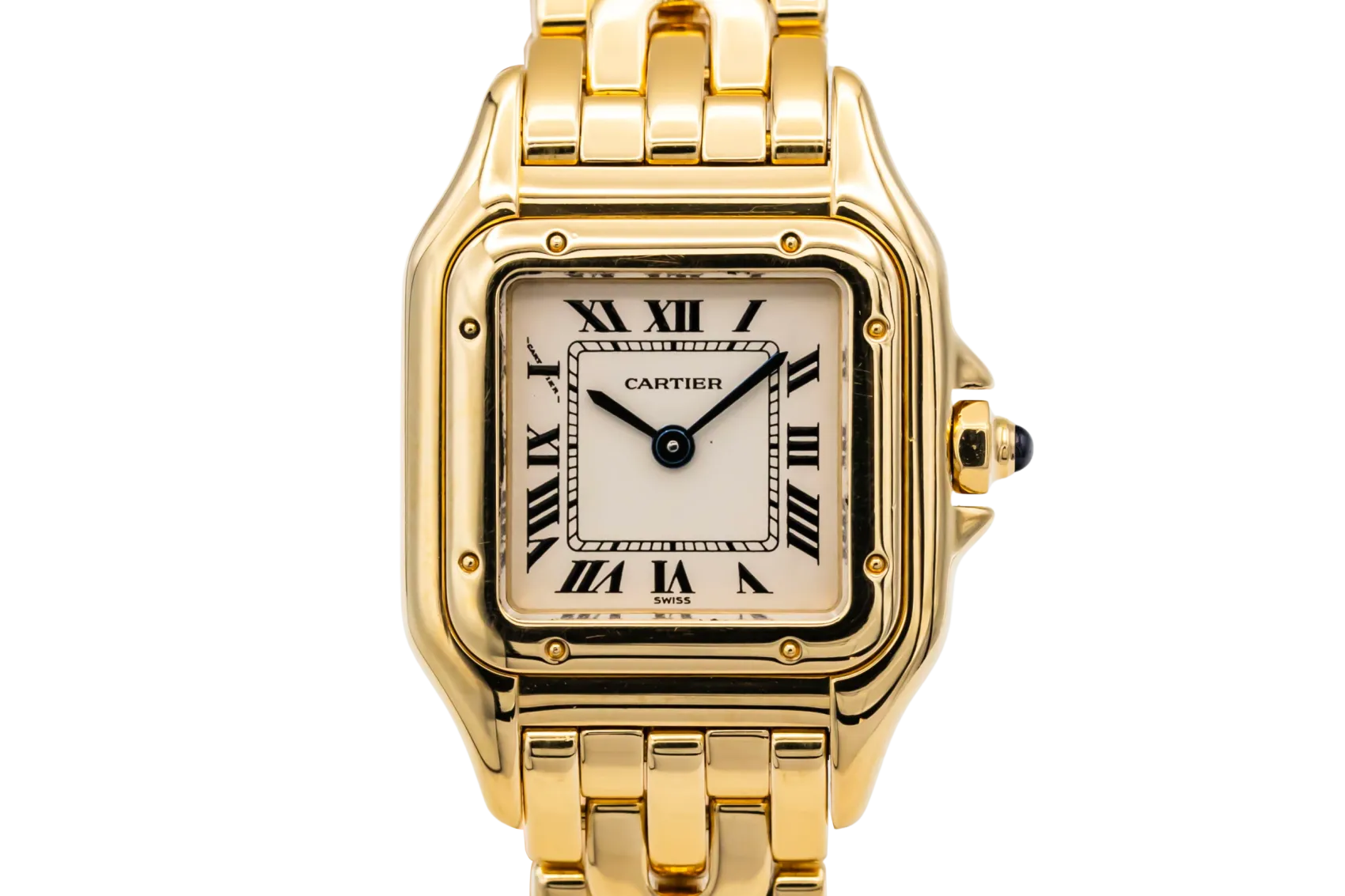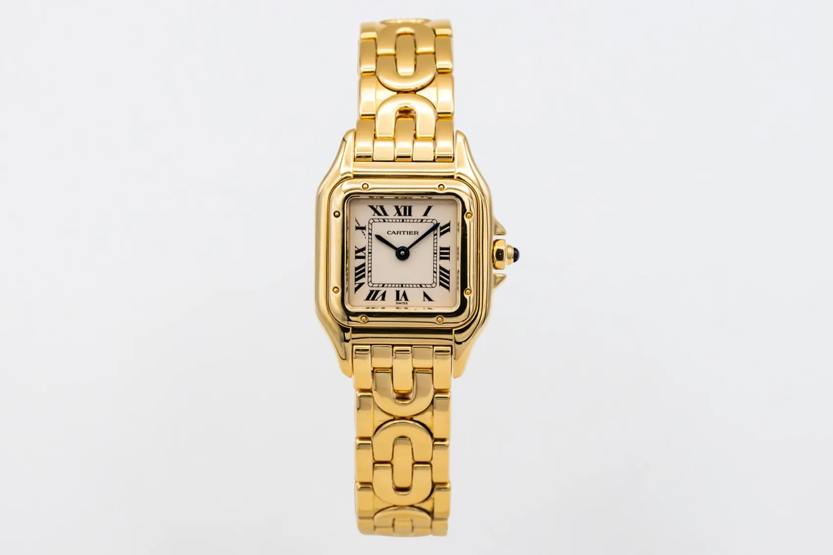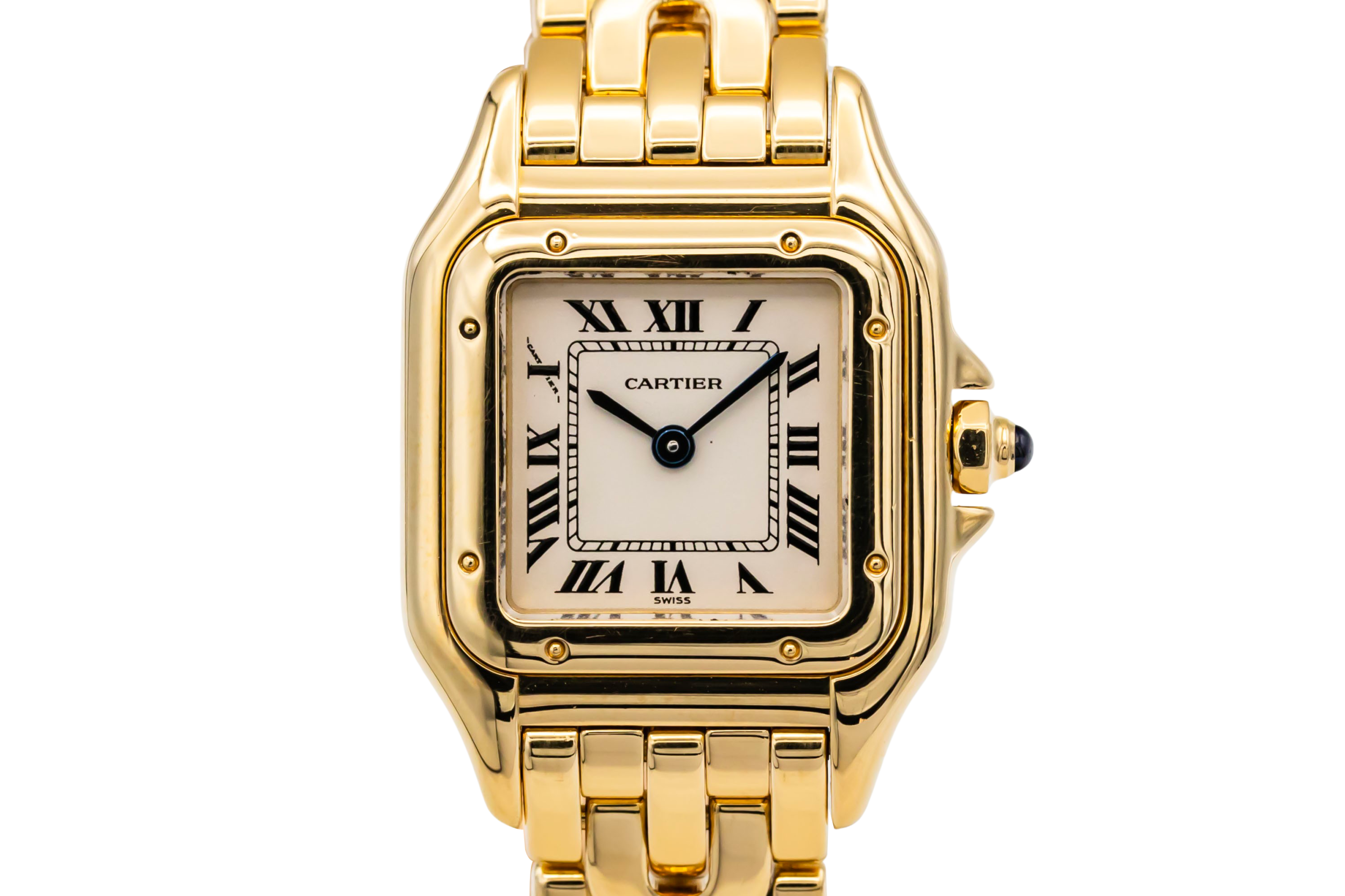 finance this from £218.87 p/m call the shop Read about our Limited Lifetime WarrantyThis circa 2010 Cartier Panthère Les Styles 22mm is an elegant timepiece crafted entirely in 18ct yellow gold, featuring a white dial with black Roman numerals, blued steel hands and a refined square case. Finished on the iconic Panthère link bracelet.