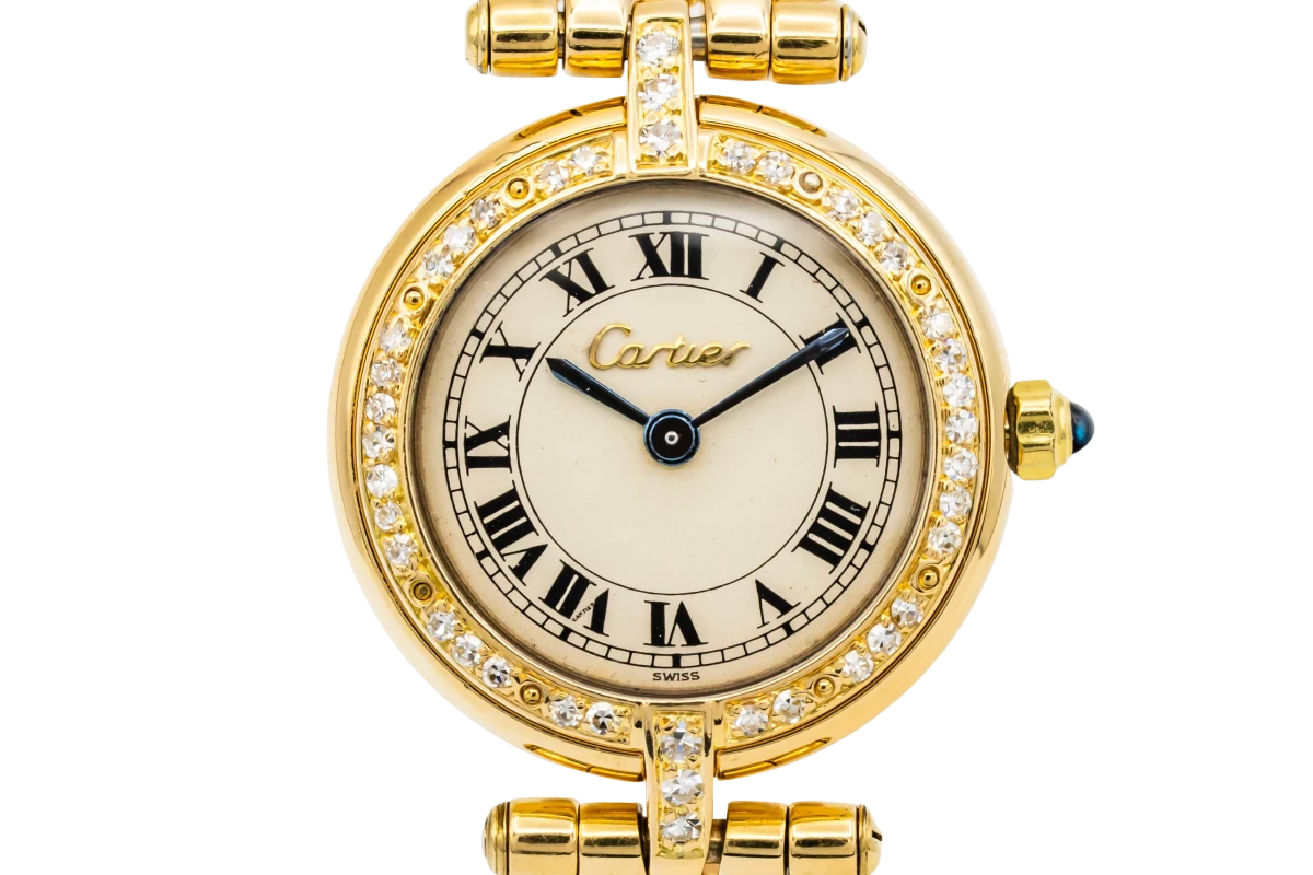 This Cartier Panthere Vendome 26mm features a white dial with roman numerals and a 18ct yellow gold bracelet. It also features a 18ct yellow gold diamond bezel.