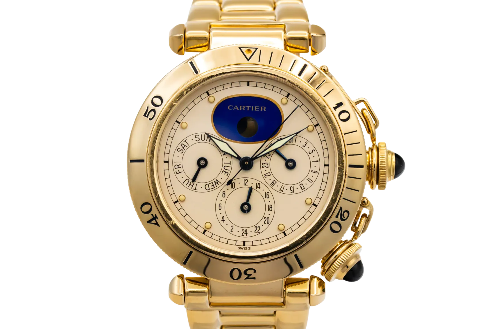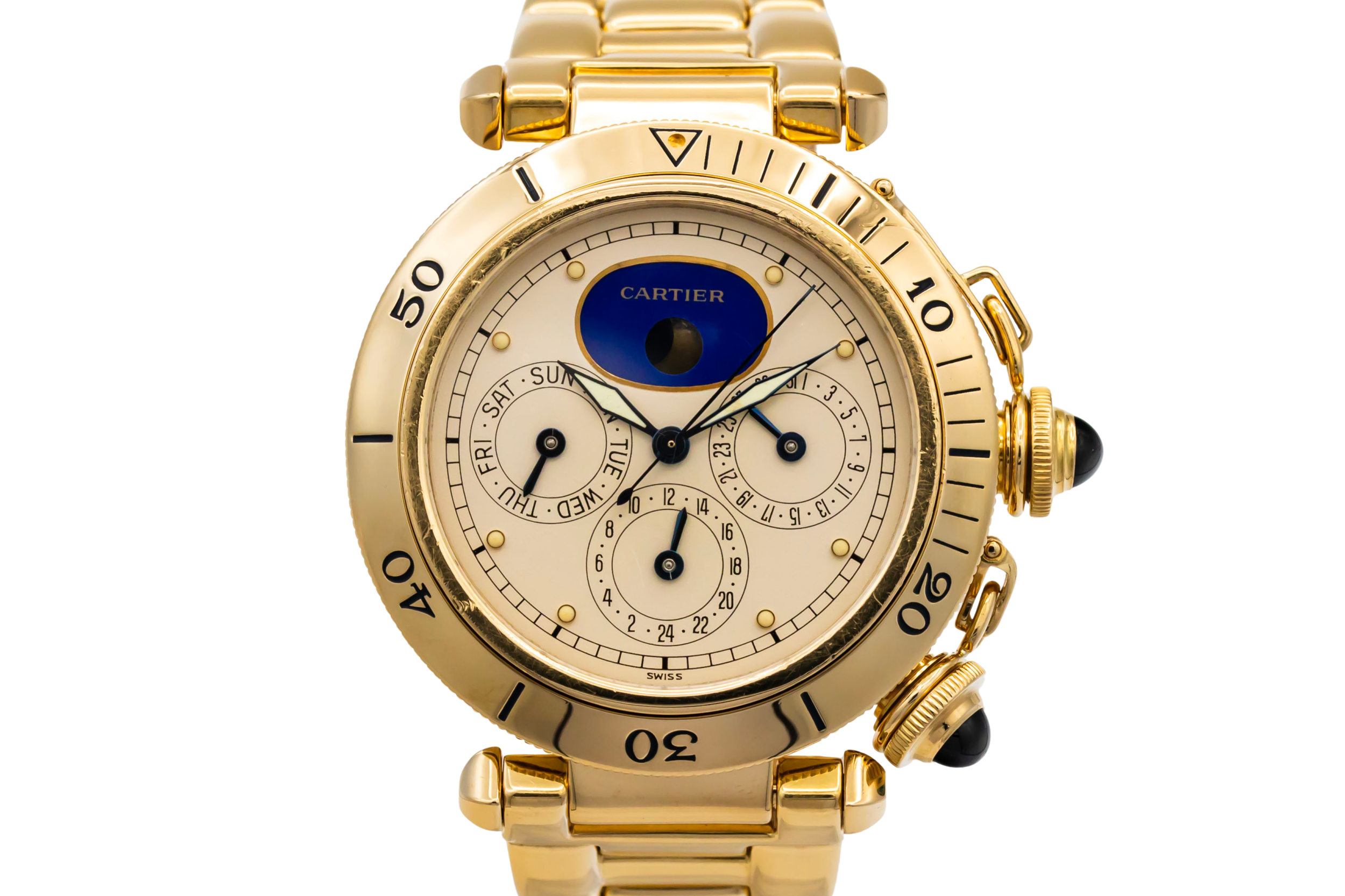 finance this from £234.51 p/m call the shop Read about our Limited Lifetime WarrantyThis 1991 Cartier Pasha Perpetual Calendar 38mm is a highly complicated luxury timepiece crafted in 18ct yellow gold, featuring a detailed dial with multiple calendar sub-dials, moonphase display and blued steel hands. The distinctive round Pasha case with screw-down crown cap and chain is finished on a 18ct yellow gold bracelet.