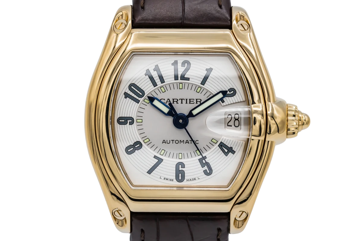A 2004 Cartier Roadster in 18ct Yellow Gold. The 37mm, 18ct yellow gold case features a two-tone silver dial with Arabic numerals, magnified date aperture at 3 o’clock, luminous hour markers, blue steel and luminous hands and sapphire crystal glass. Presented on a Cartier black leather strap.