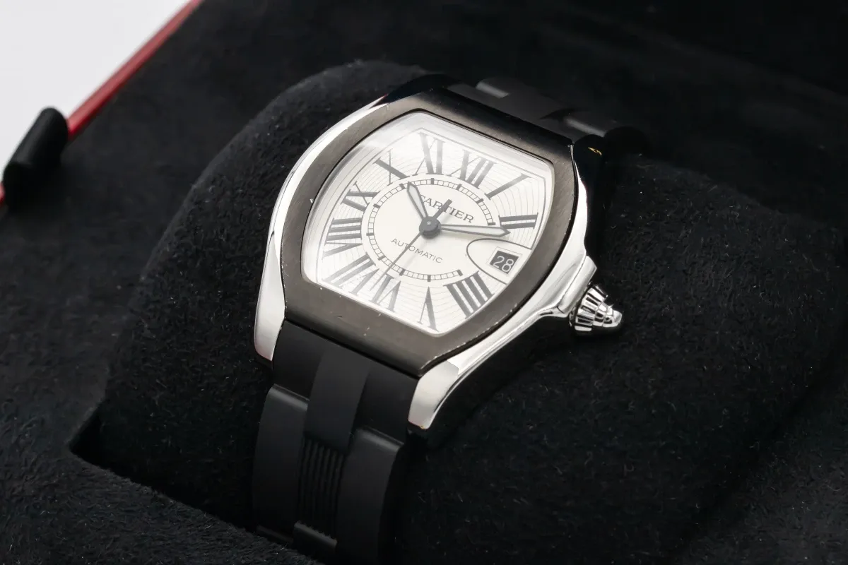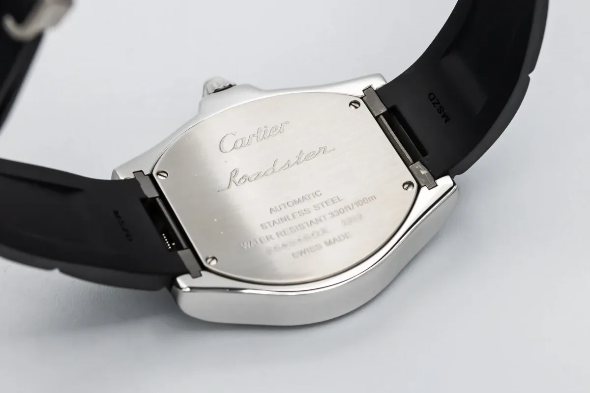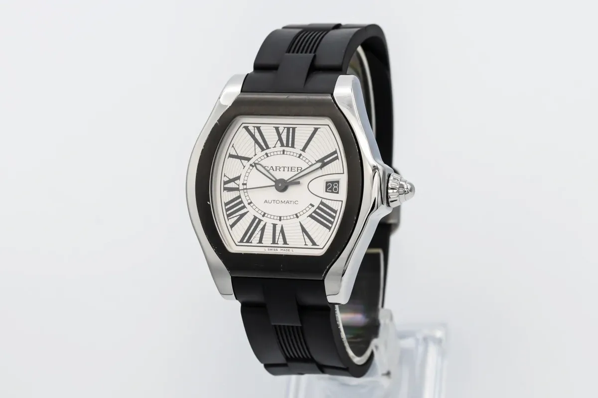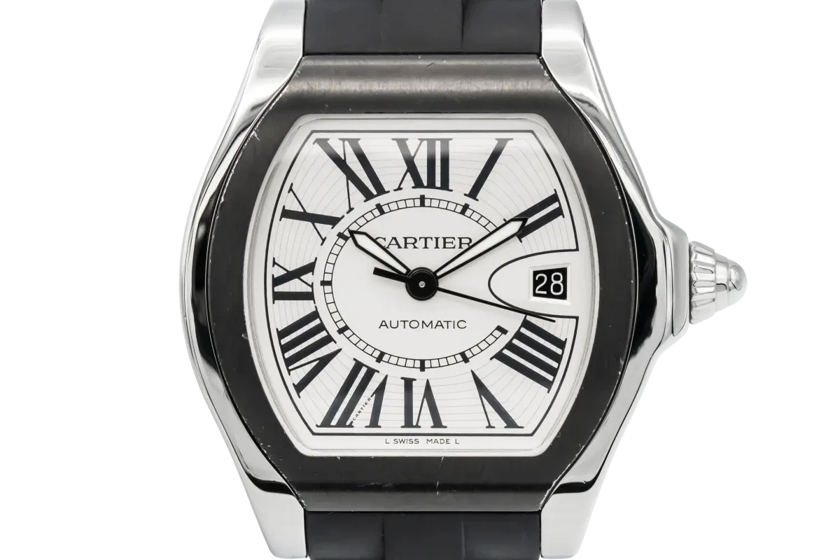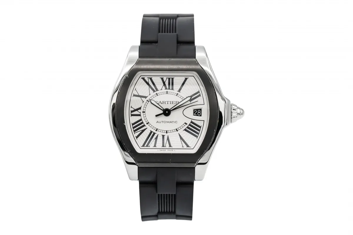 finance this from £74.3 p/m call the shop Read about our Limited Lifetime WarrantyThe circa 2010 Cartier Roadster 39mm features a sleek black dial with bold Roman numerals and luminous sword hands for excellent readability, while the date display sits between 3 and 4 o’clock with Cartier’s signature magnifier. Fitted with a black rubber strap, this Roadster combines dynamic sportiness with the refinement of Cartier design, creating a striking wrist presence that’s equally at home on casual and sophisticated occasions.