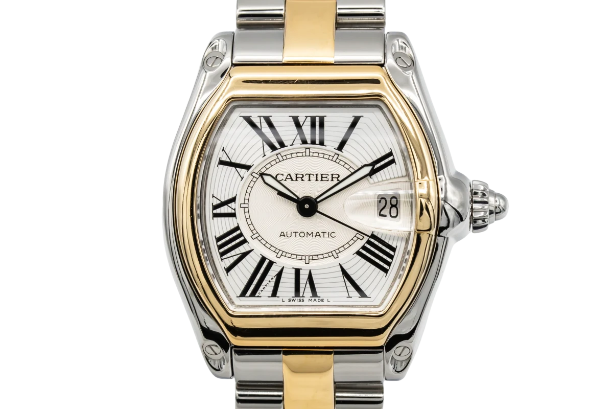 This 2007 Cartier Roadster 37mm features a silver dial with roman numerals, magnified date aperture at 3 o’clock and a 18ct yellow gold bezel, Presented on a stainless steel and 18ct yellow gold strap.