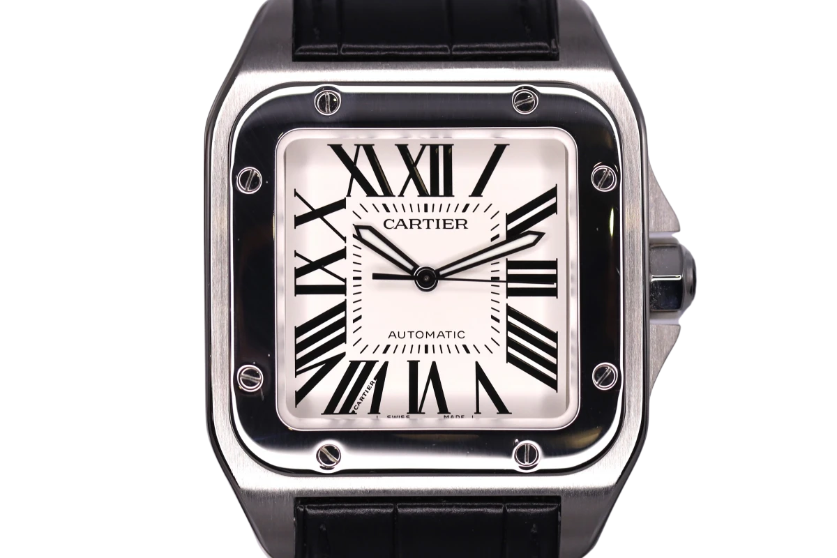 Stainless Steel 100 XL Cartier Santos features a black interchangeable leather strap. Perfect everday watch.