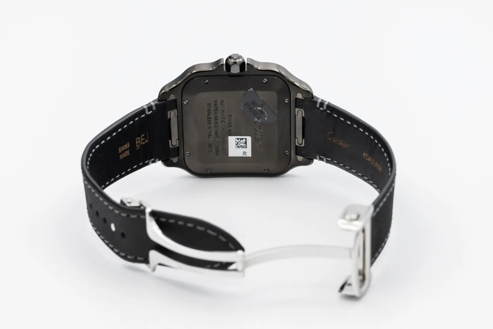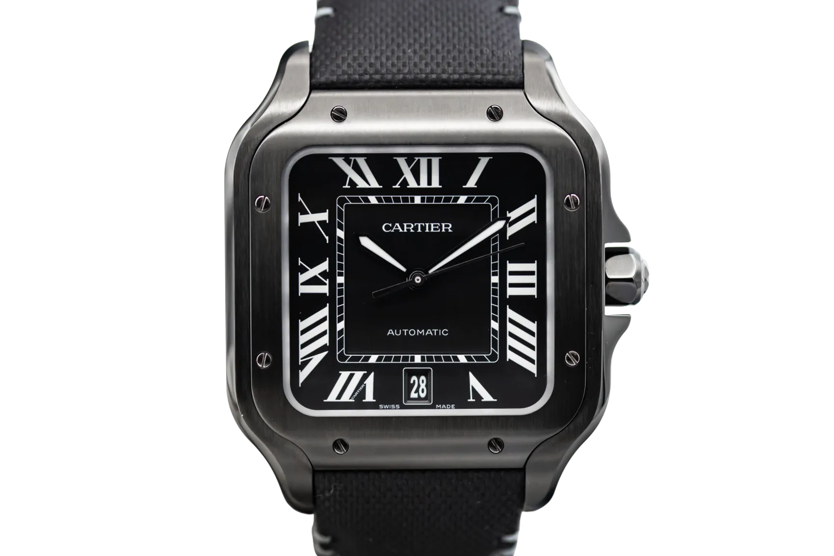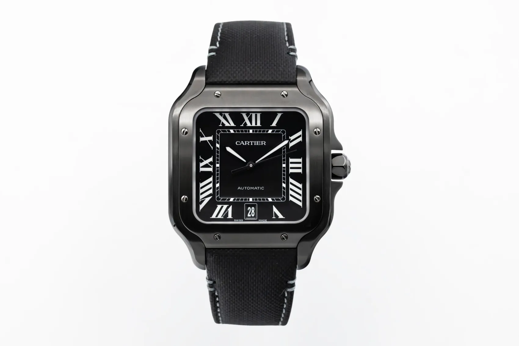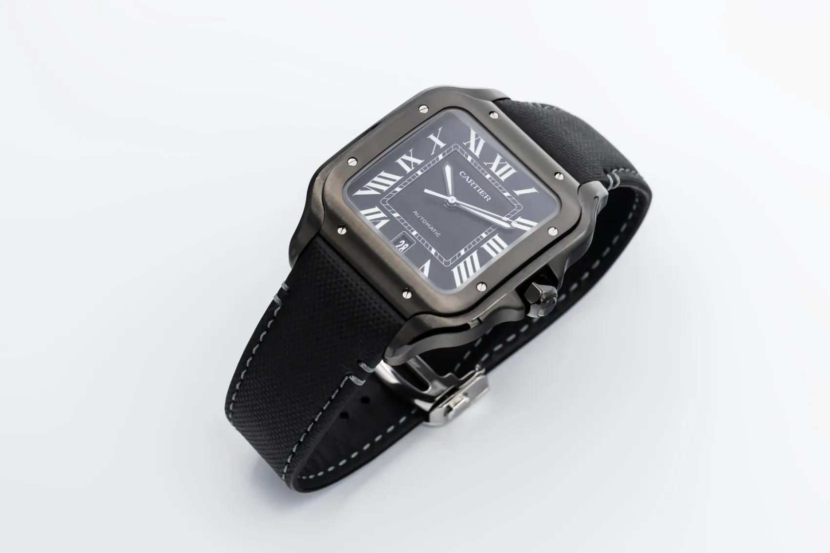 finance this from £106.27 p/m call the shop Read about our Limited Lifetime WarrantyThis 2025 Cartier Santos De Cartier 39.8mm is a modern and sporty timepiece crafted in ADLC-coated stainless steel, featuring a black dial with Roman numerals, luminous hands and date display. The iconic square case is paired with a black leather strap.