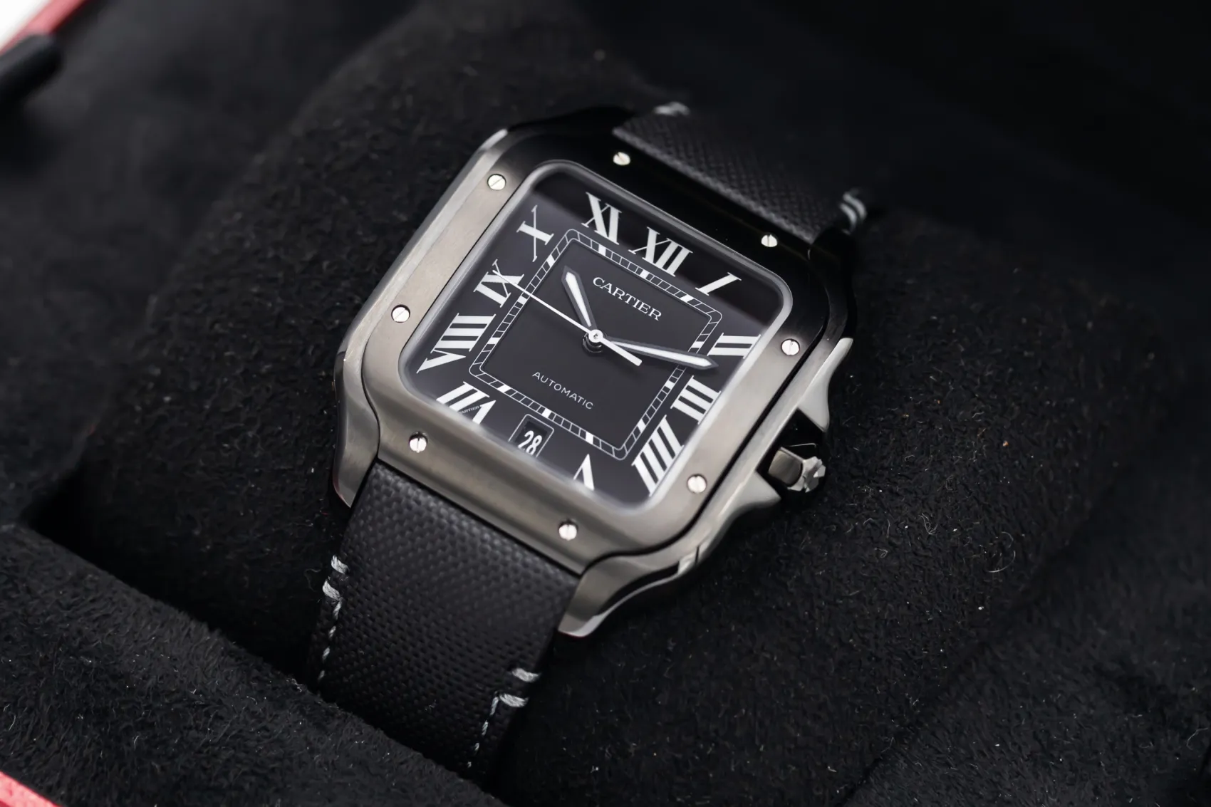 Originally created in 1904, the Santos is one of the first wristwatches ever made. The ADLC models offer a contemporary interpretation with a stealthy, all-black aesthetic.