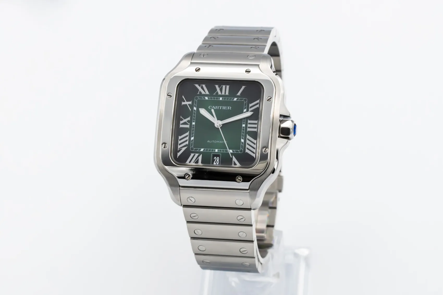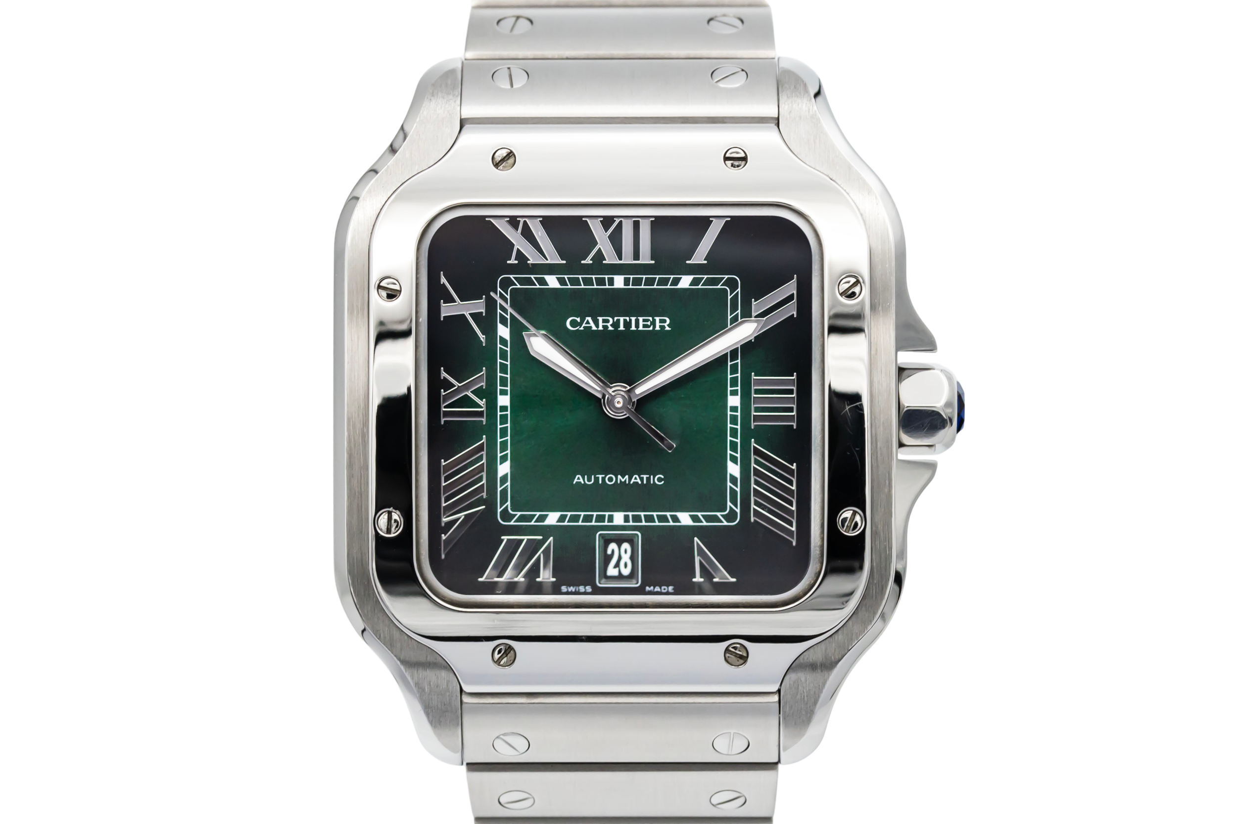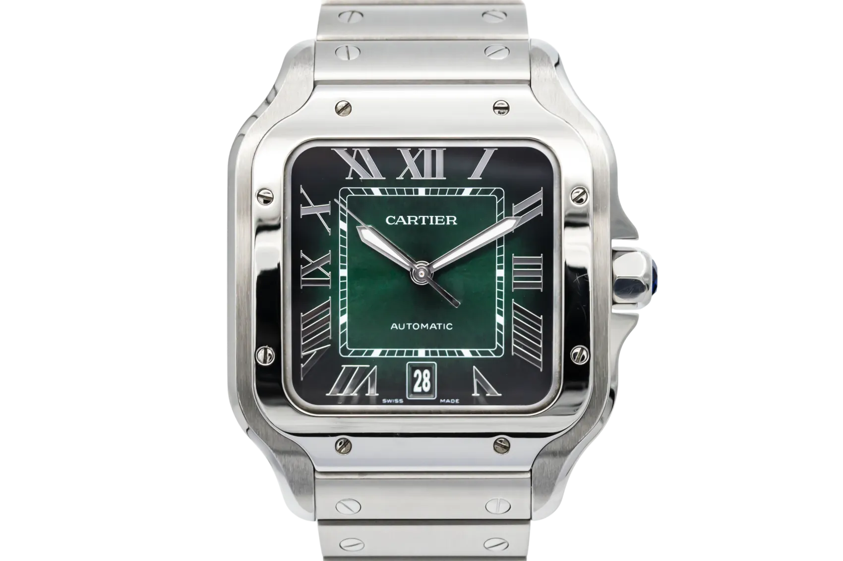 finance this from £106.27 p/m call the shop Read about our Limited Lifetime WarrantyThis 2024 Cartier Santos De Cartier 39.8mm is a refined luxury timepiece crafted in stainless steel, featuring a green sunburst dial with roman numeral markers, luminous hands and date display. The iconic square case with exposed screws is finished on the stainless steel bracelet.