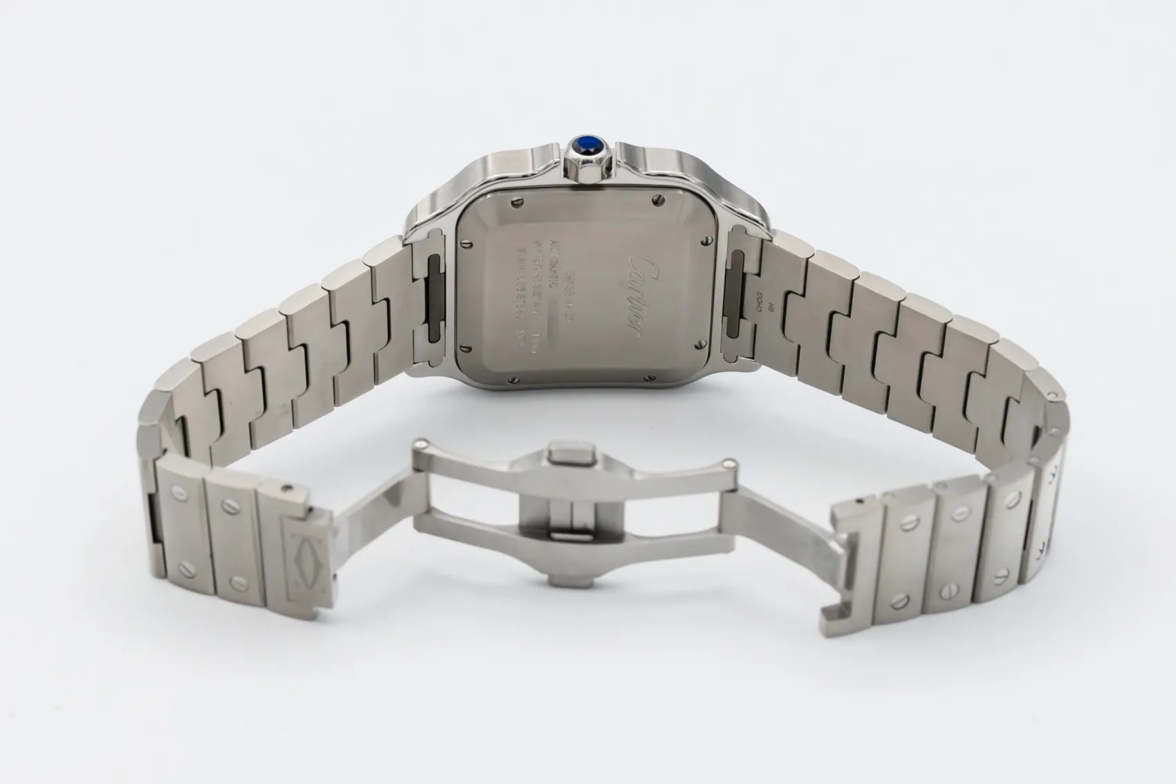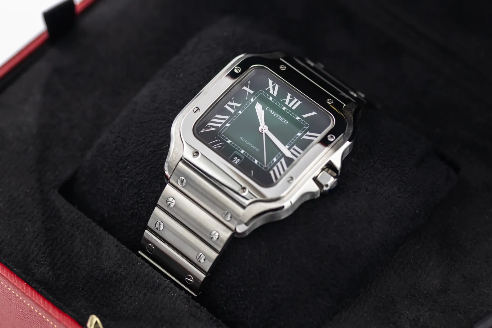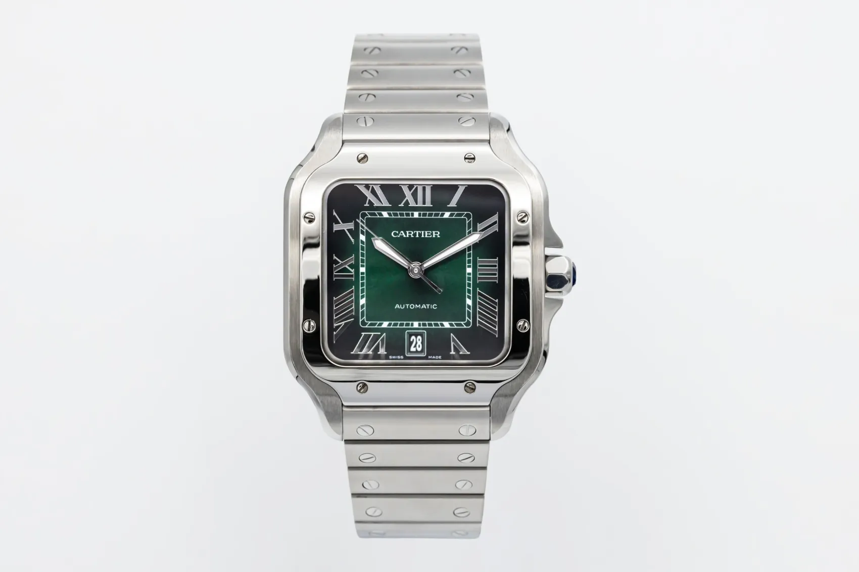 finance this from £106.27 p/m call the shop Read about our Limited Lifetime WarrantyThis 2024 Cartier Santos De Cartier 39.8mm is a refined luxury timepiece crafted in stainless steel, featuring a green sunburst dial with roman numeral markers, luminous hands and date display. The iconic square case with exposed screws is finished on the stainless steel bracelet.