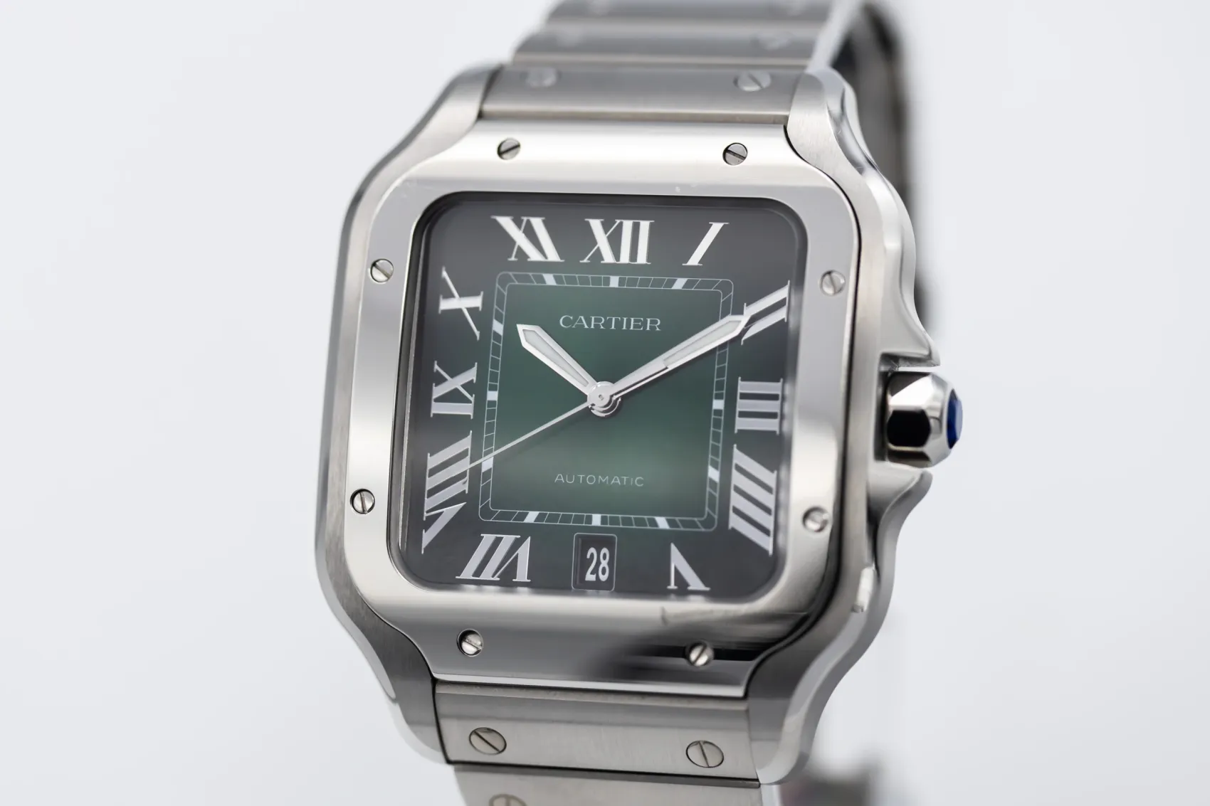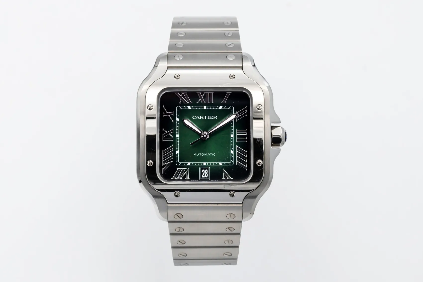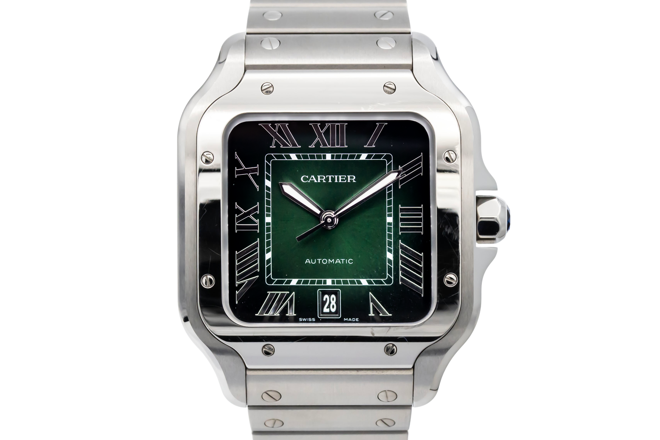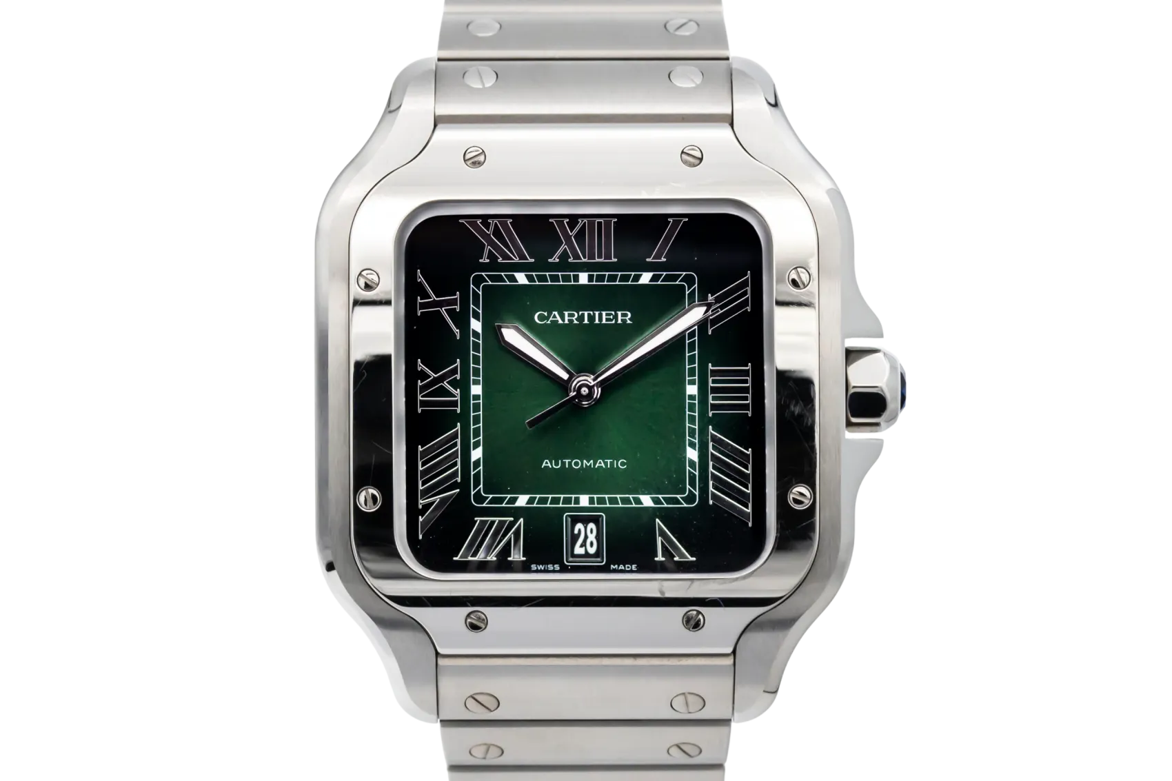 finance this from £106.27 p/m call the shop Read about our Limited Lifetime WarrantyThis 2025 Cartier Santos De Cartier 39.8mm is a refined luxury timepiece crafted in stainless steel, featuring a green sunburst dial with applied hour markers, luminous hands and a date display. The iconic square case with exposed screws is finished on the stainless steel bracelet.
