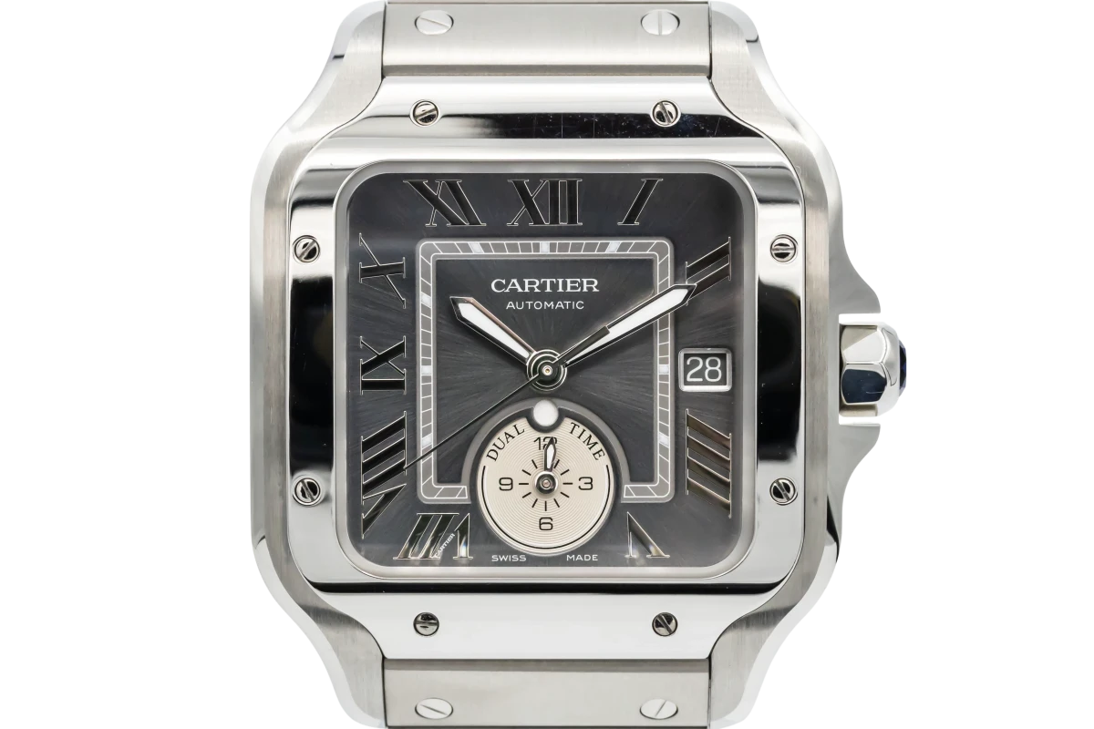 This 2024 Cartier Santos features a 40mm grey dial with roman numeral markers and an automatic self-winding movement, along with a dual time zone display for added functionality. It also includes a stainless steel bracelet and a smooth stainless steel bezel.