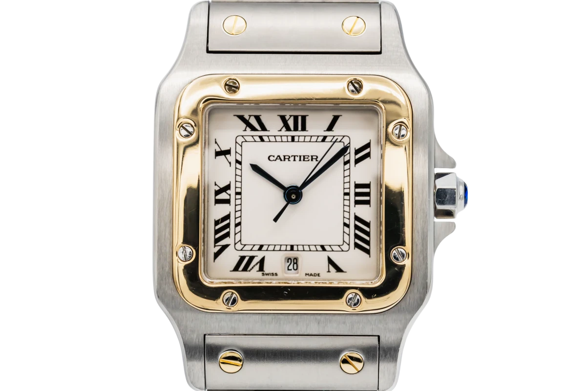 This circa 1995 Cartier Santos Galbee 29mm features a white dial with roman numerals and a stainless steel and 18ct yellow gold bracelet. It also features a 18ct yellow gold smooth bezel.