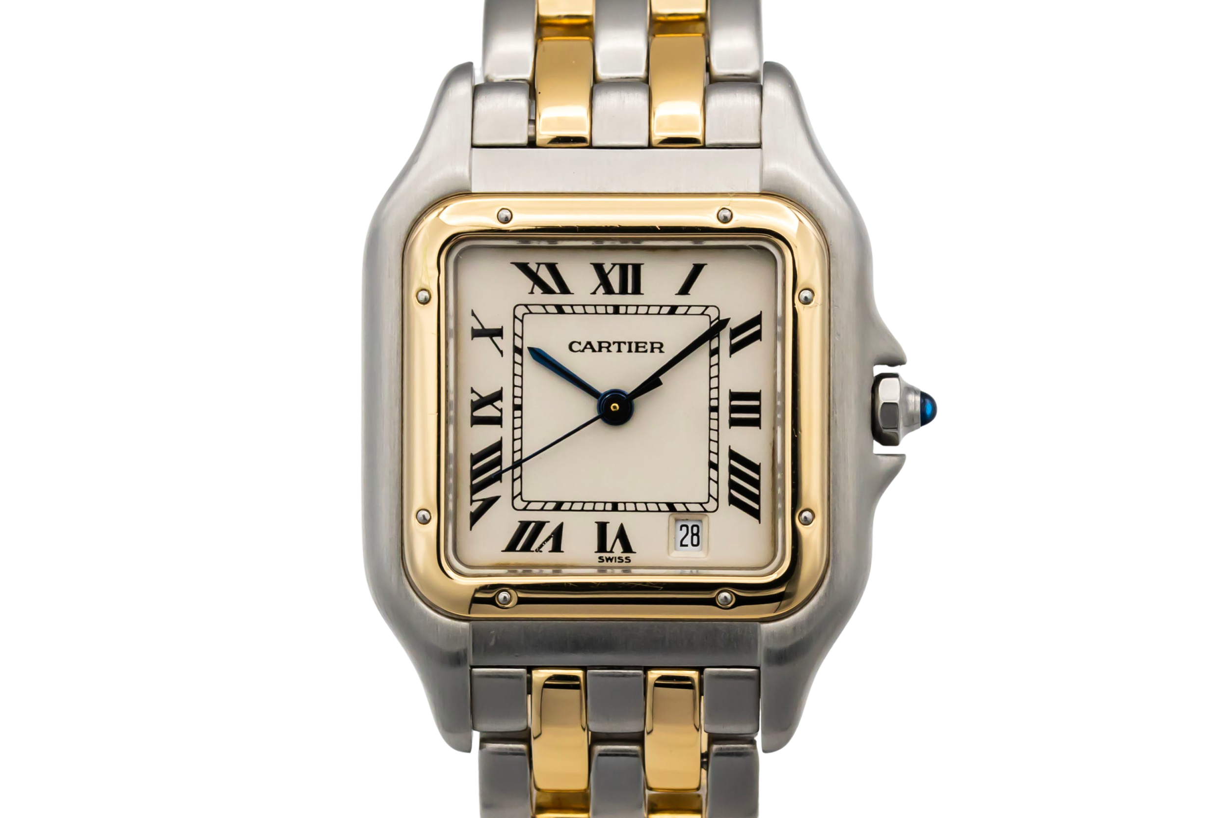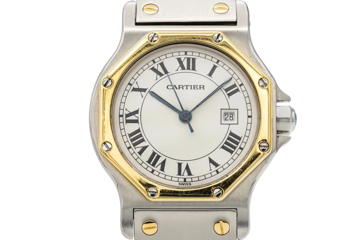 This 1990s Cartier Santos Octagon 30mm features a white dial with Roman numeral markers, housed in a distinctive stainless steel and 18ct yellow gold case. Its octagonal bezel and two-tone design make it a timeless and sophisticated piece.