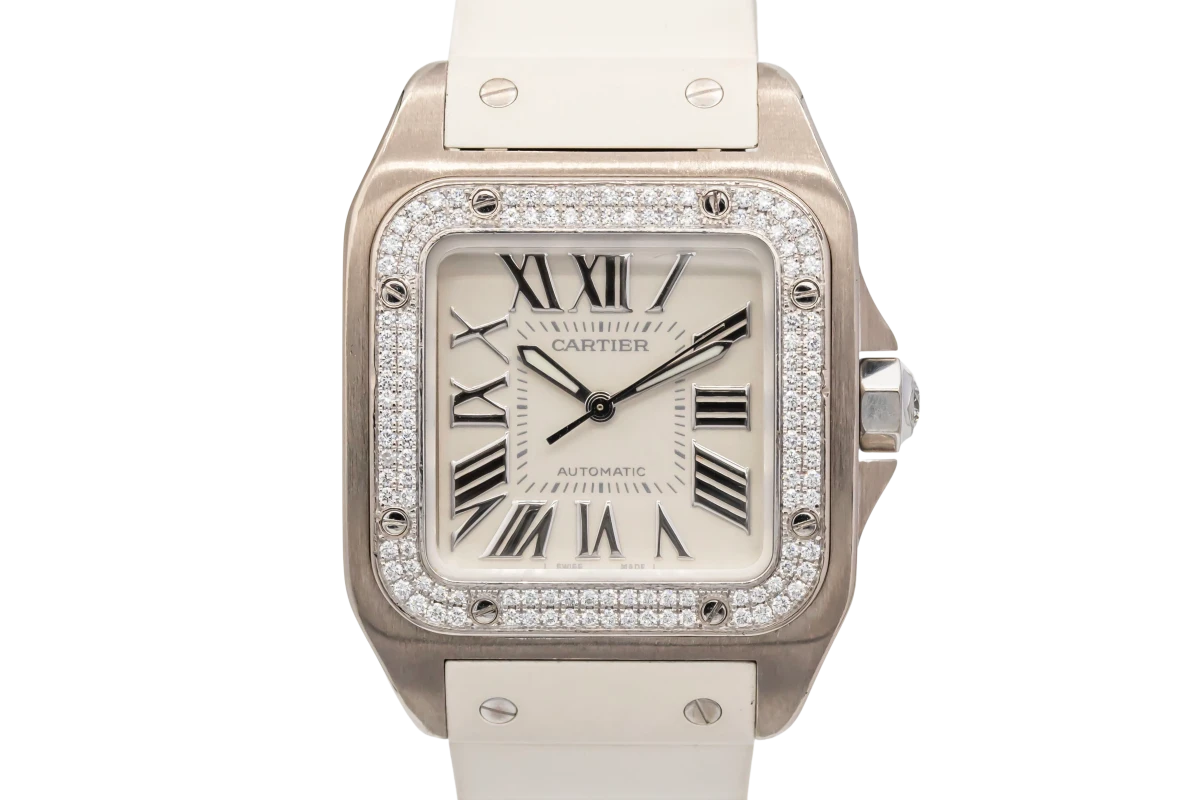 This 2009 Cartier Santos 100 33x44mm features a white dial with roman numeral markers and a white rubber bracelet. It is also fitted with a 18ct white gold diamond bezel with Cartier's famous screw fittings.