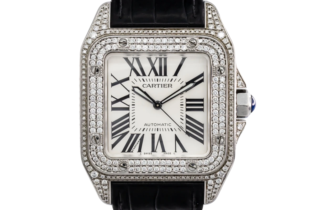This 2012 Cartier Santos 100 XL features a 41mm white roman numeral dial and a black leather bracelet. It also features a square polished finish custom diamond bezel.