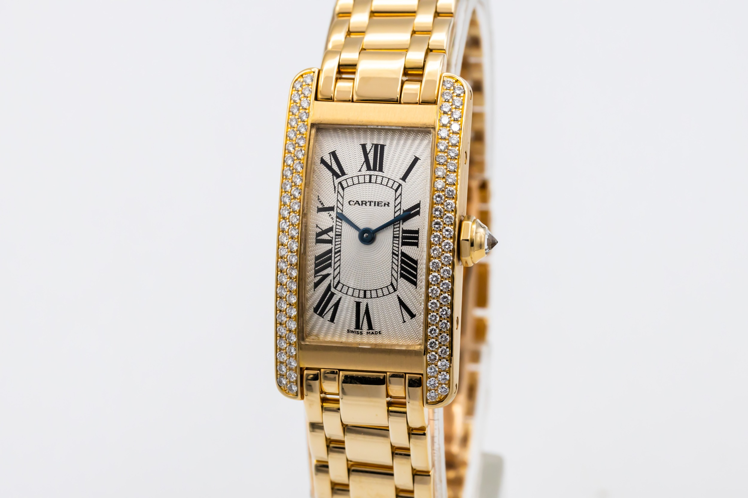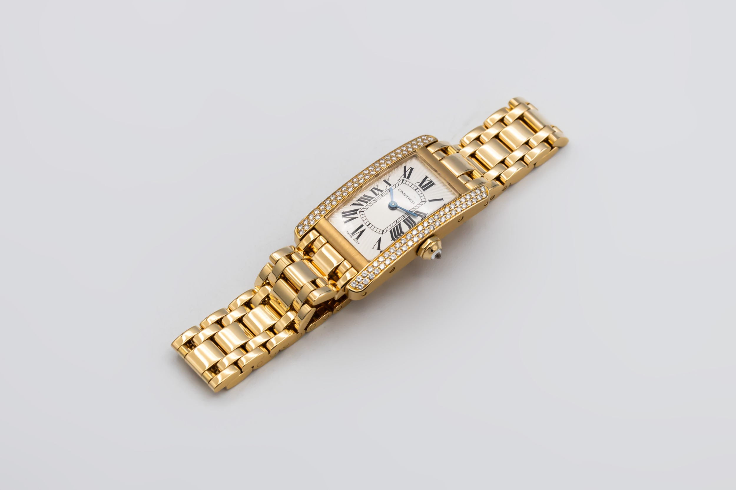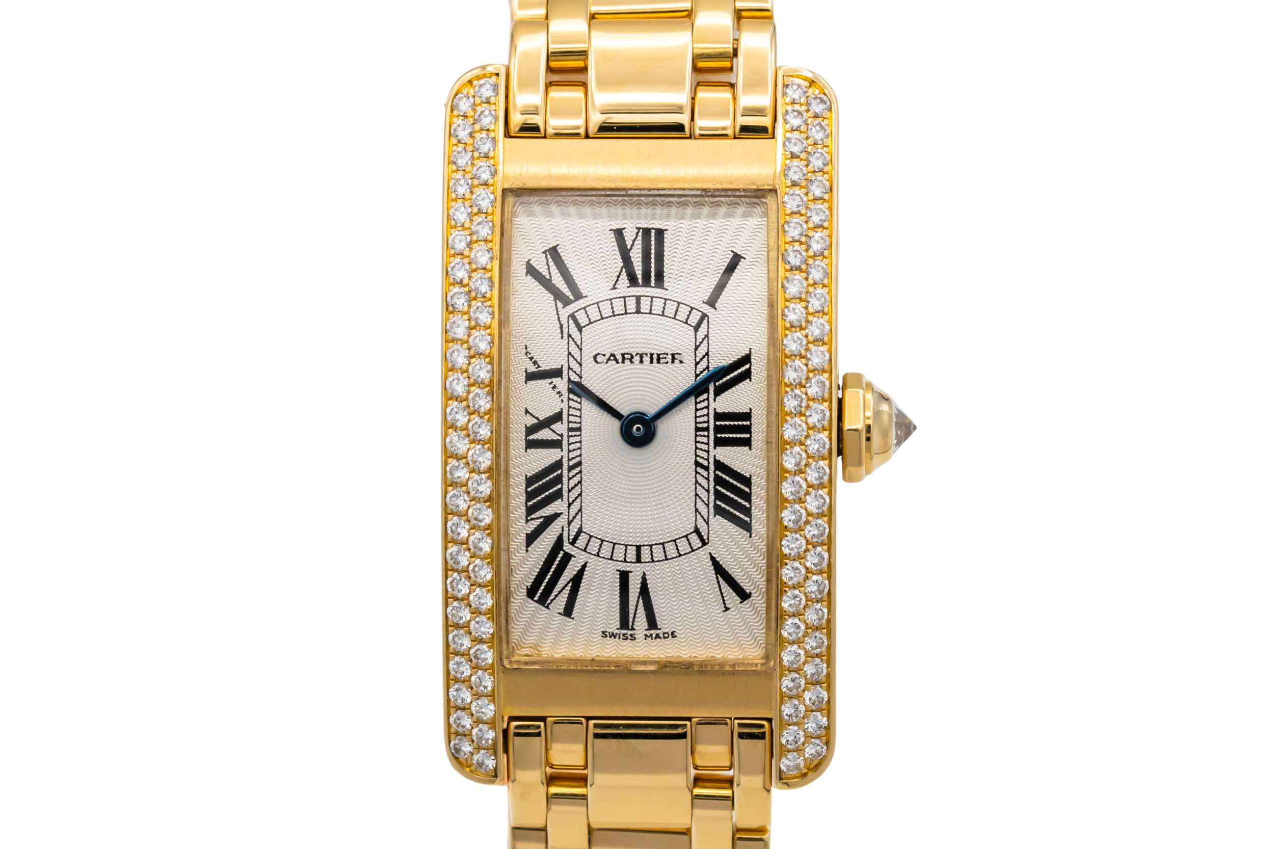 This circa 2000s Cartier Tank Americaine 19mm is an elegant luxury timepiece crafted in 18ct yellow gold, featuring a silvered guilloché dial with black Roman numerals, blued steel hands and a diamond-set case. Finished on an integrated yellow gold bracelet.