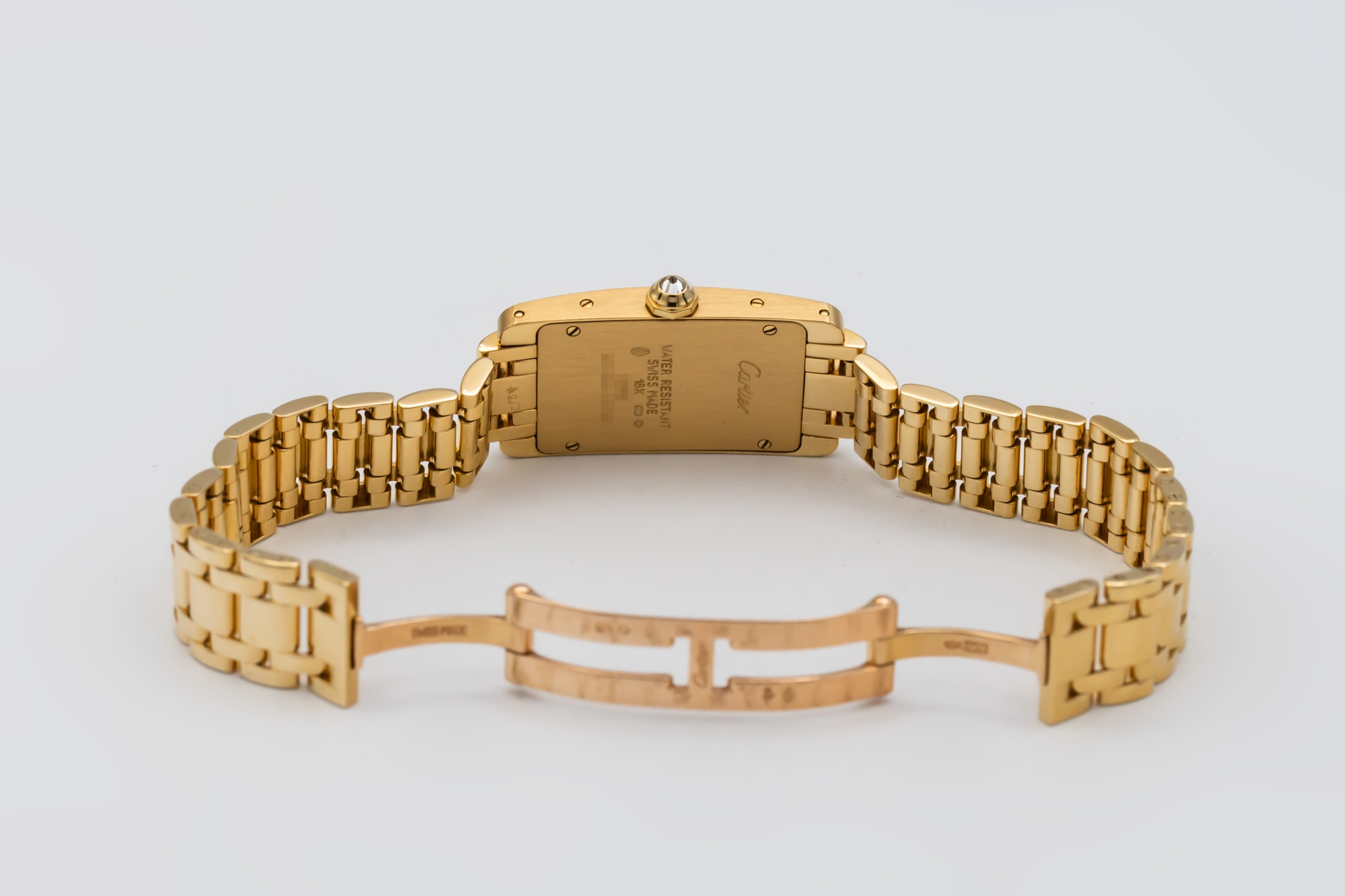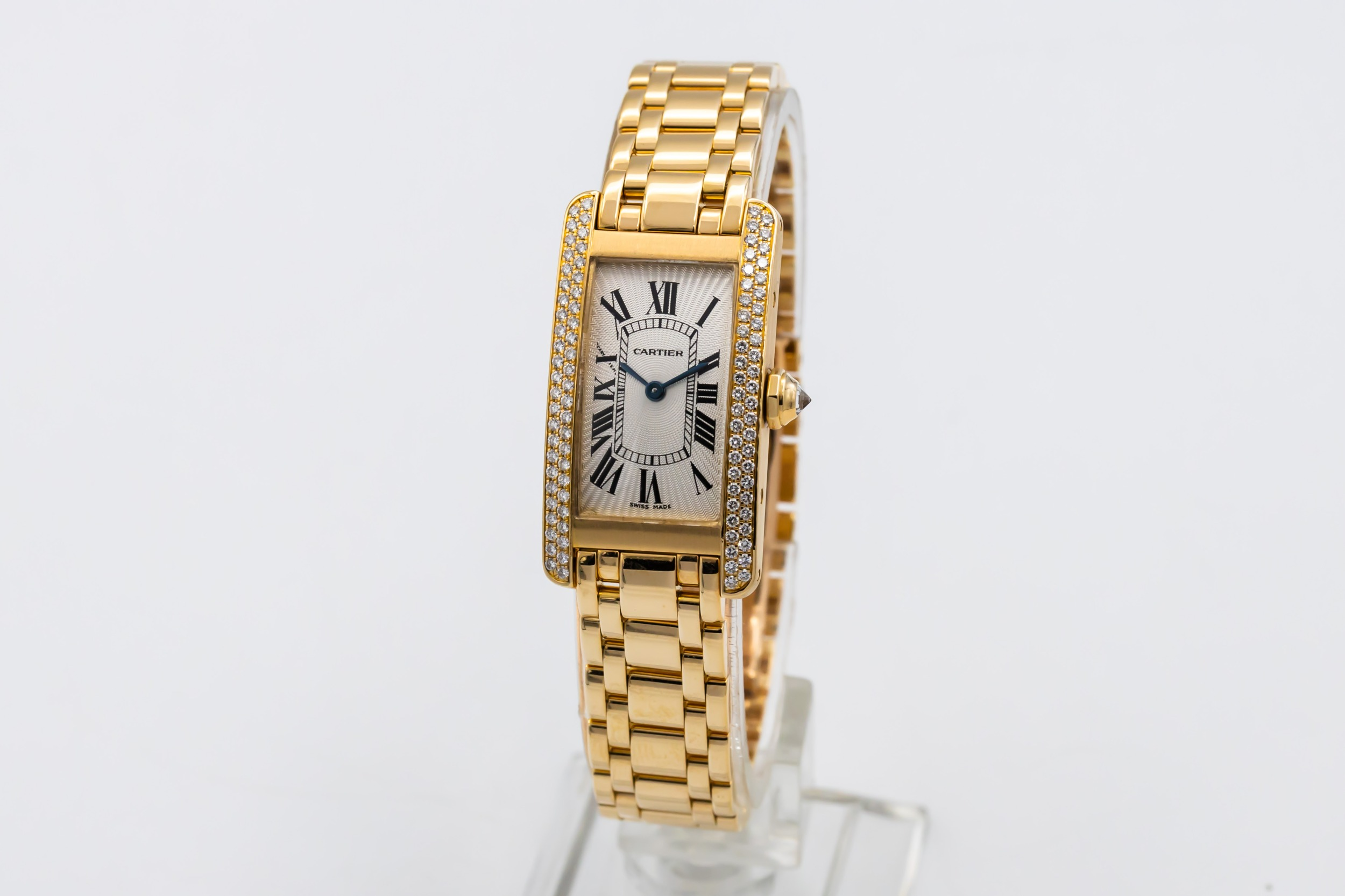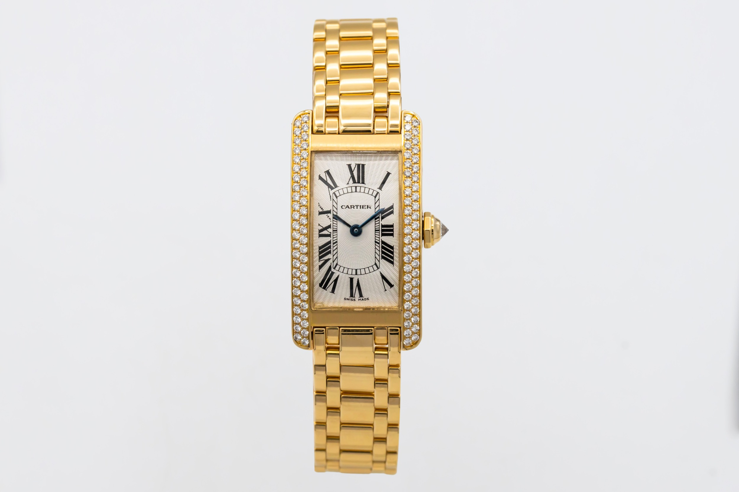 This circa 2000s Cartier Tank Americaine 19mm is an elegant luxury timepiece crafted in 18ct yellow gold, featuring a silvered guilloché dial with black Roman numerals, blued steel hands and a diamond-set case. Finished on an integrated yellow gold bracelet.