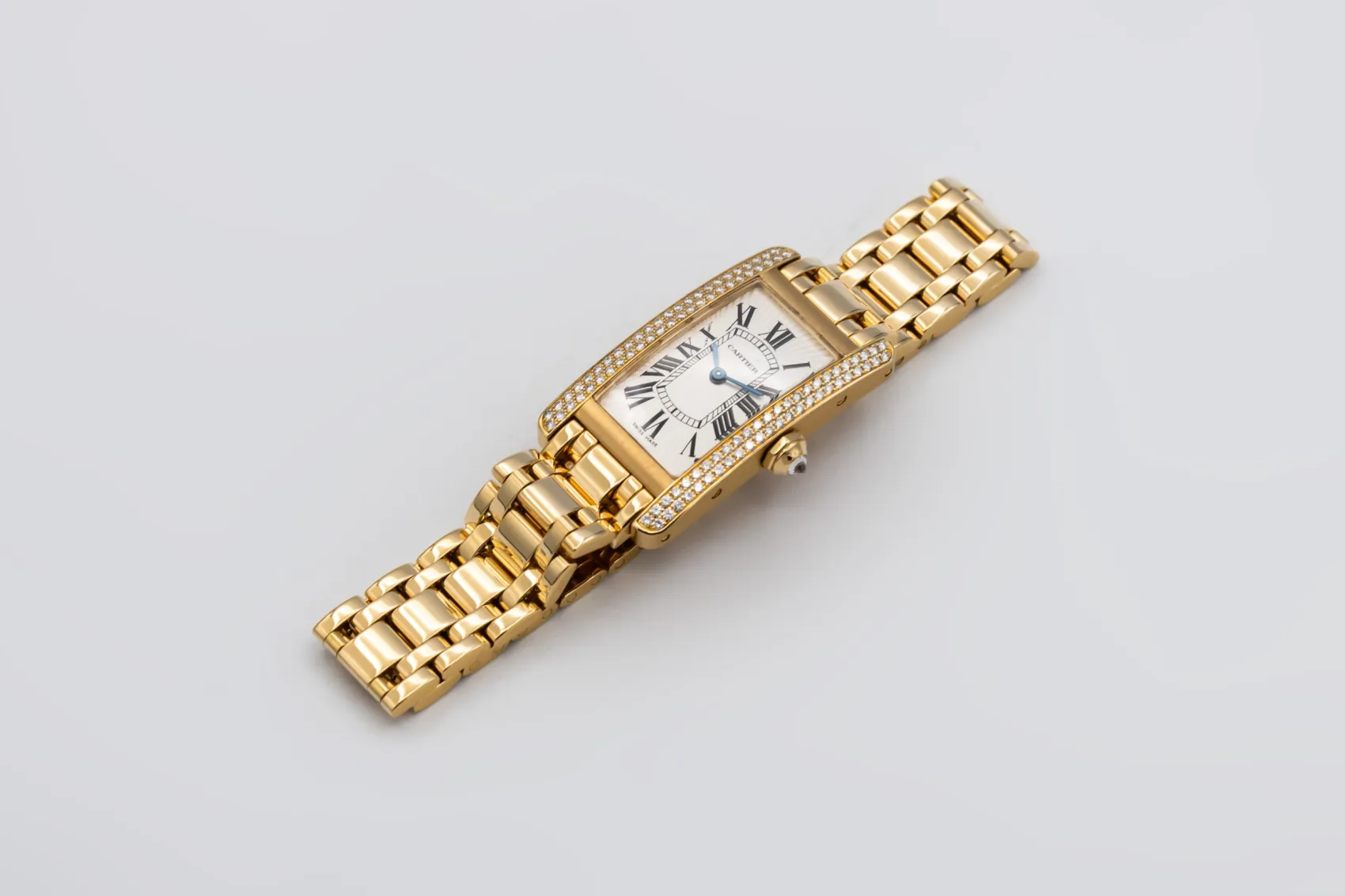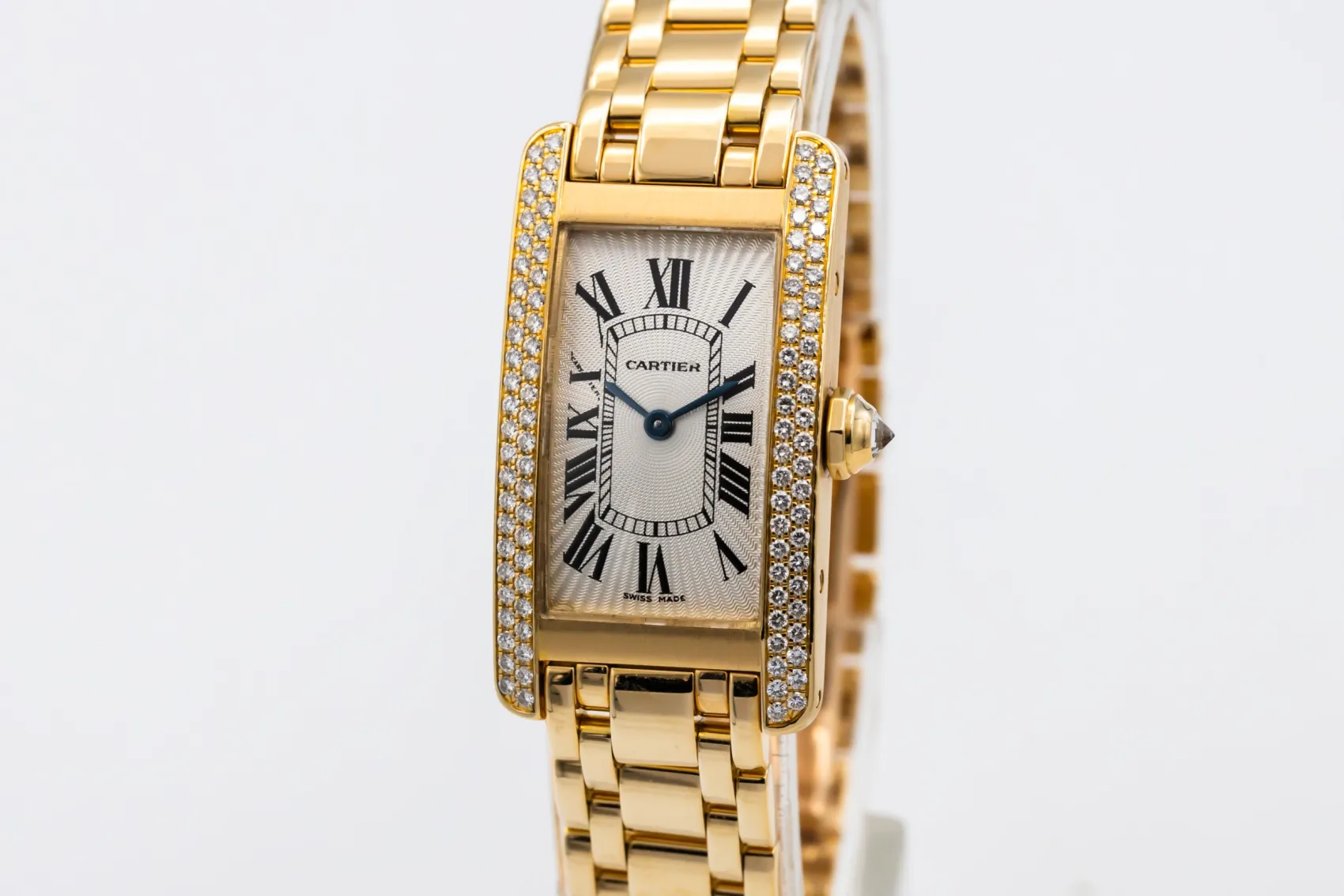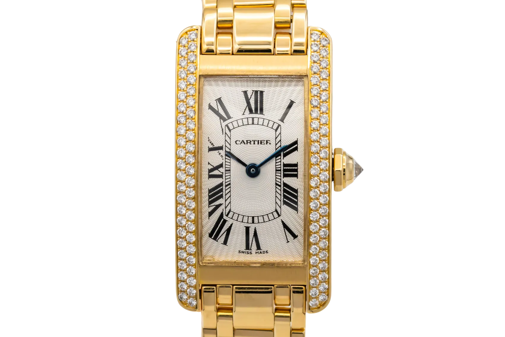 finance this from £242.33 p/m call the shop Read about our Limited Lifetime WarrantyThis circa 2000s Cartier Tank Americaine 19mm is an elegant luxury timepiece crafted in 18ct yellow gold, featuring a silvered guilloché dial with black Roman numerals, blued steel hands and a diamond-set case. Finished on an integrated yellow gold bracelet.