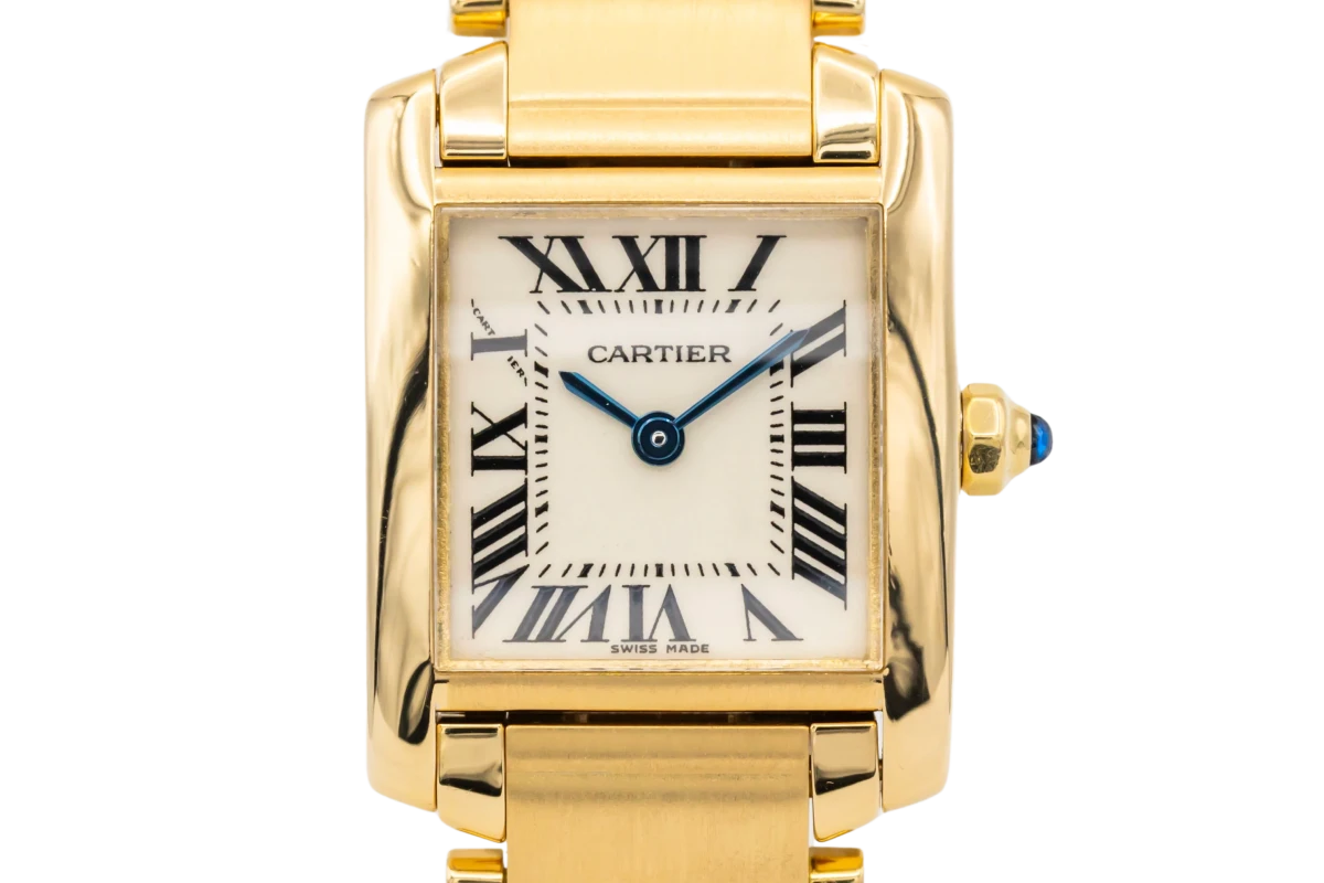 This 2010 Cartier Tank Francaise 20mm features a silver dial with roman numerals and a 18ct yellow gold bracelet. It also features a smooth 18ct yellow gold bezel.