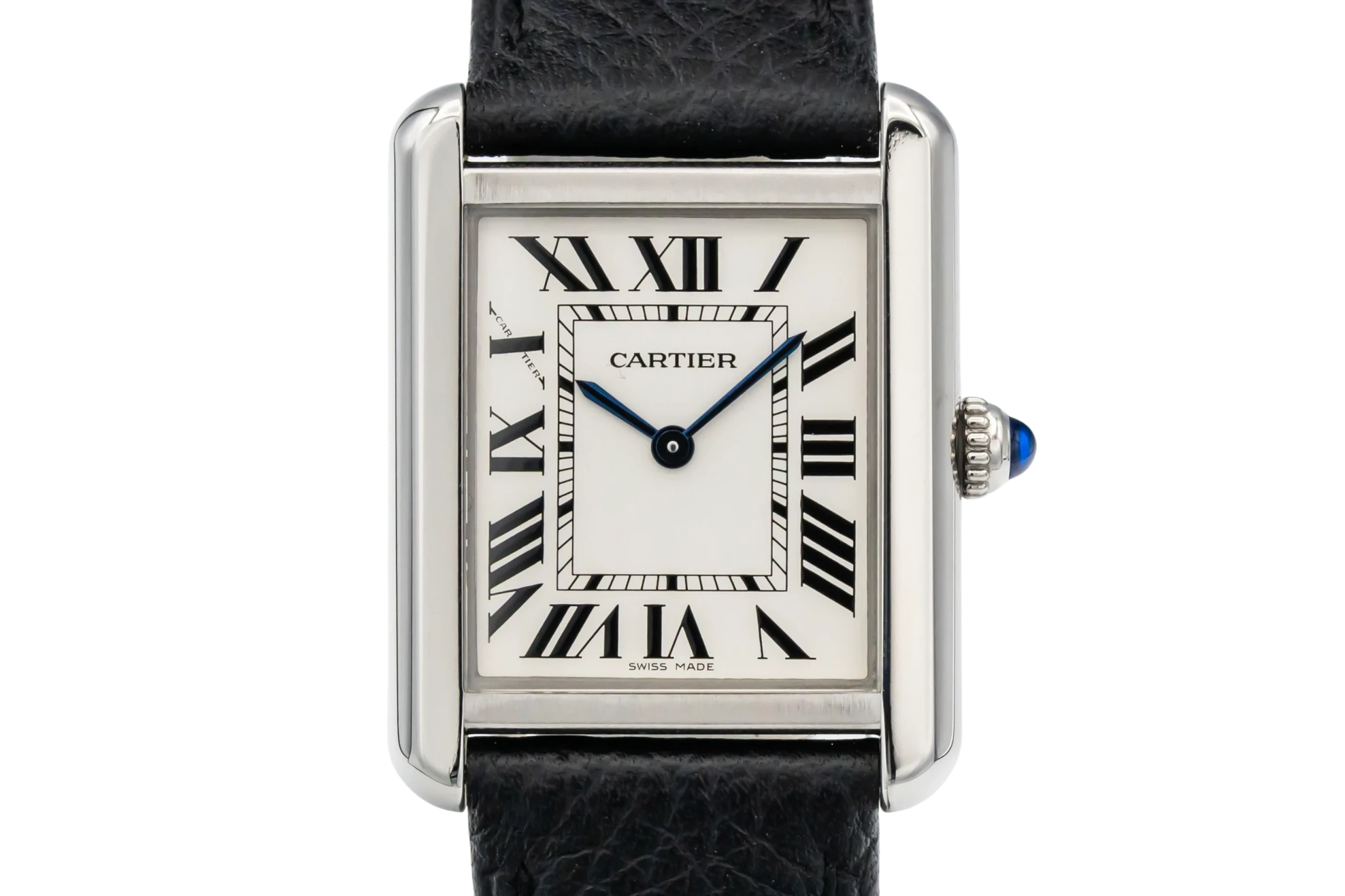 This circa 2010 Cartier Tank Solo 24mm features a silver dial with roman numeral markers. It also features a leather bracelet and a smooth stainless steel bezel.