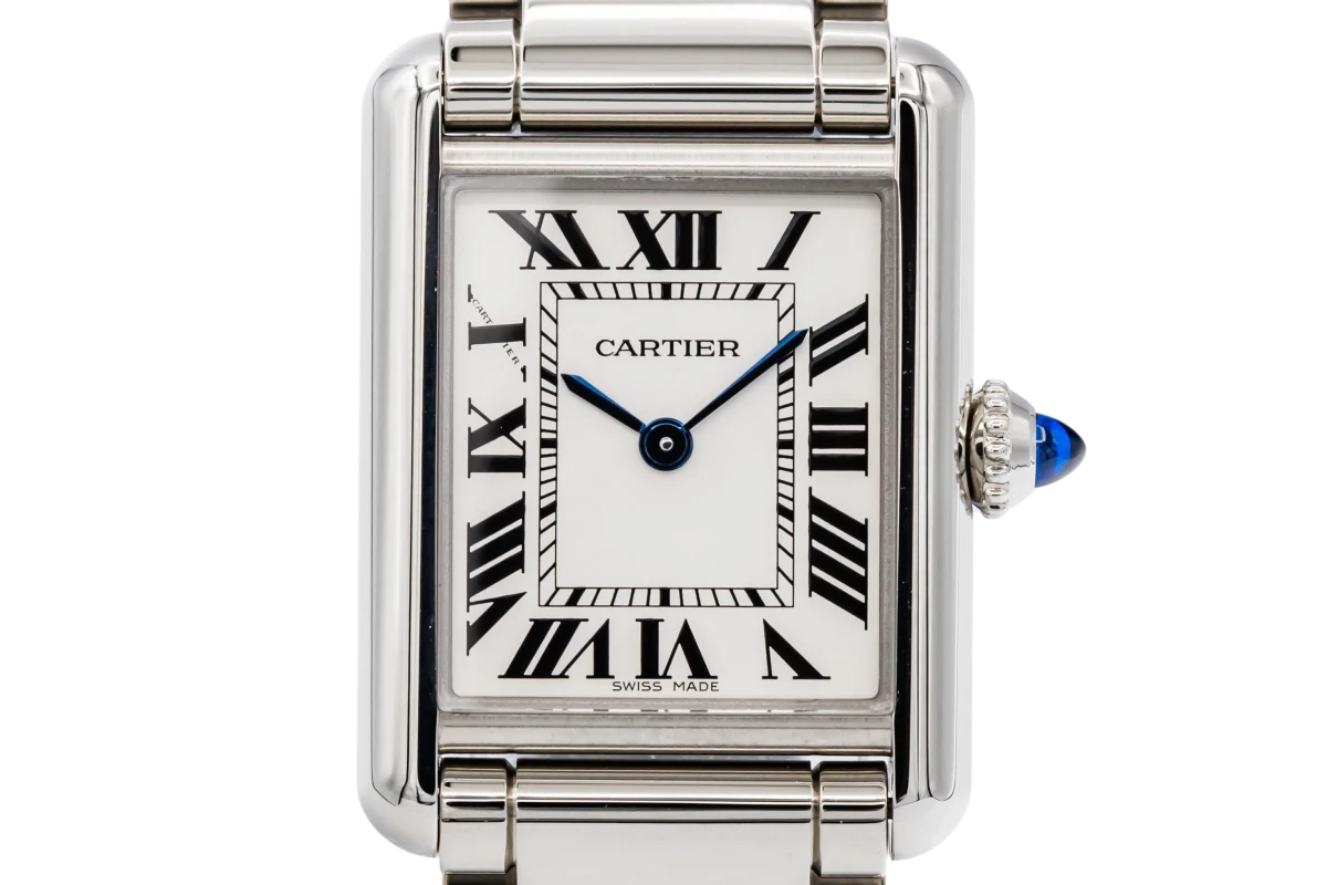 This Cartier Tank Must 22mm features a silver dial with roman numerals and a stainless steel bracelet. It also features a smooth stainless steel bezel.