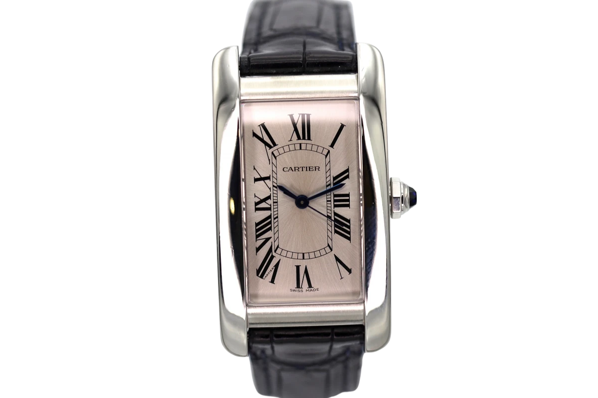 This Cartier Tank Américaine has a distinctive elongated case which features more of a curve than the original rectangular shape. This powerful model has a stainless steel case and clasp with a black leather strap, a classy every day watch.