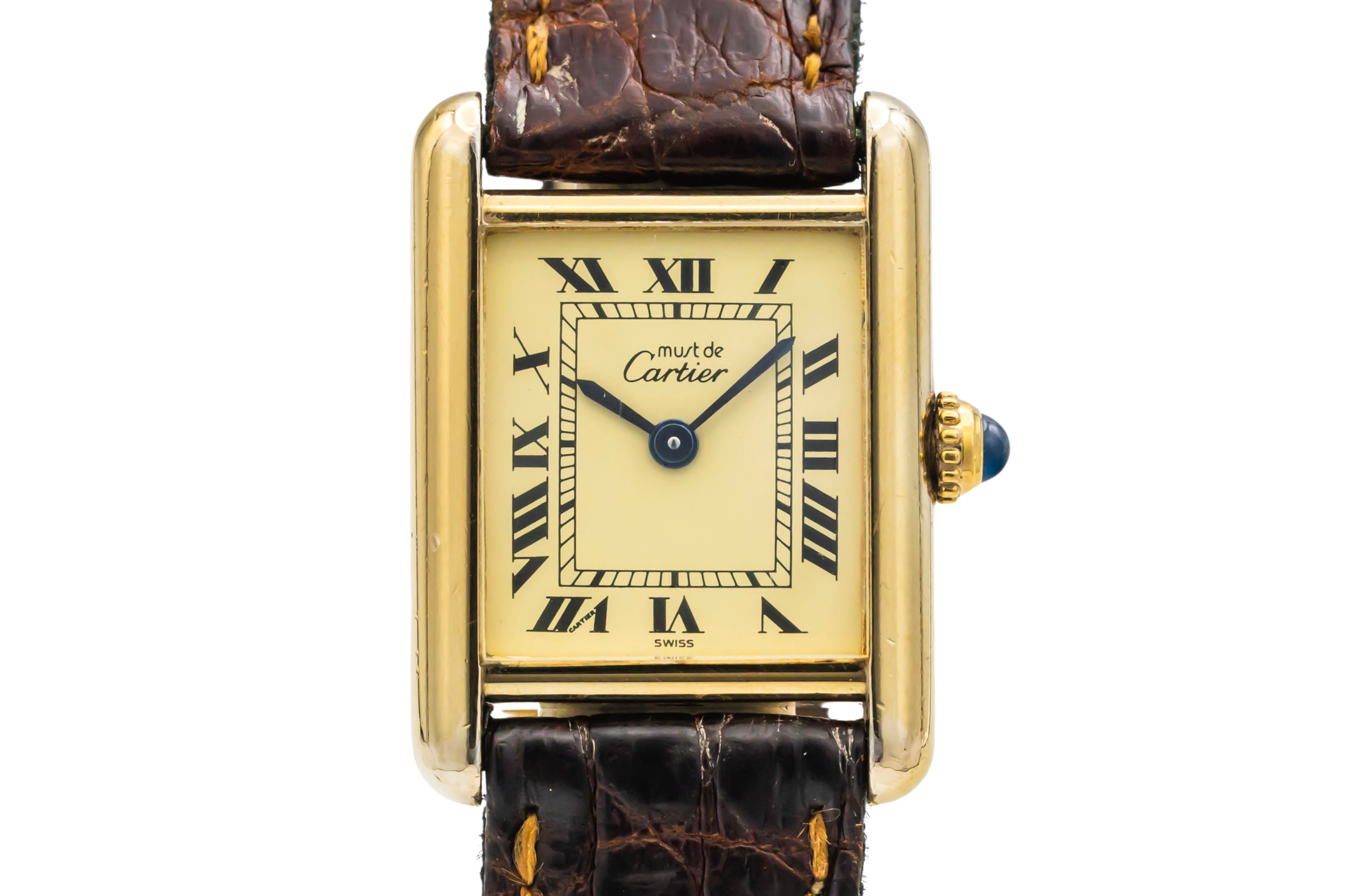 finance this from £28.07 p/m call the shop Read about our Limited Lifetime WarrantyThis 1993 Cartier Tank Vermeil 20mm is a classic and elegant dress watch crafted from gold-plated sterling silver. The silvered dial features black Roman numeral hour markers and Cartier’s signature blued steel hands, offering timeless sophistication and excellent legibility. Finished on a brown leather strap with the iconic rectangular Tank case.