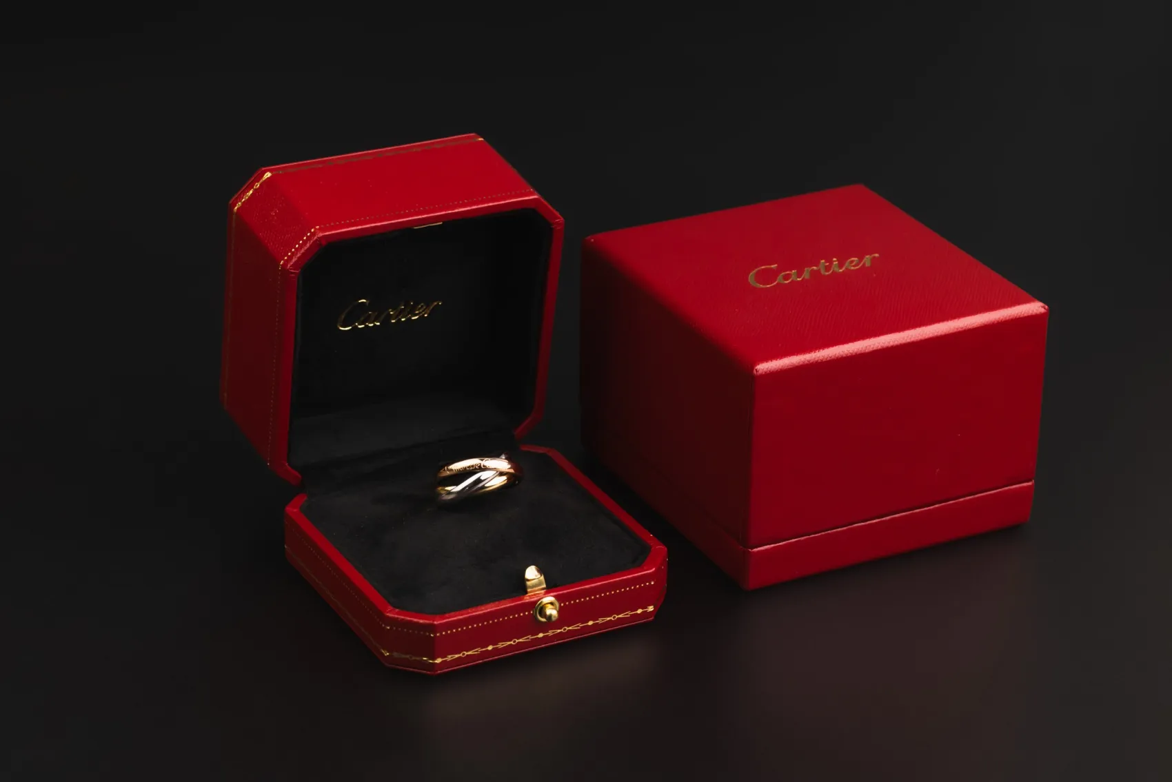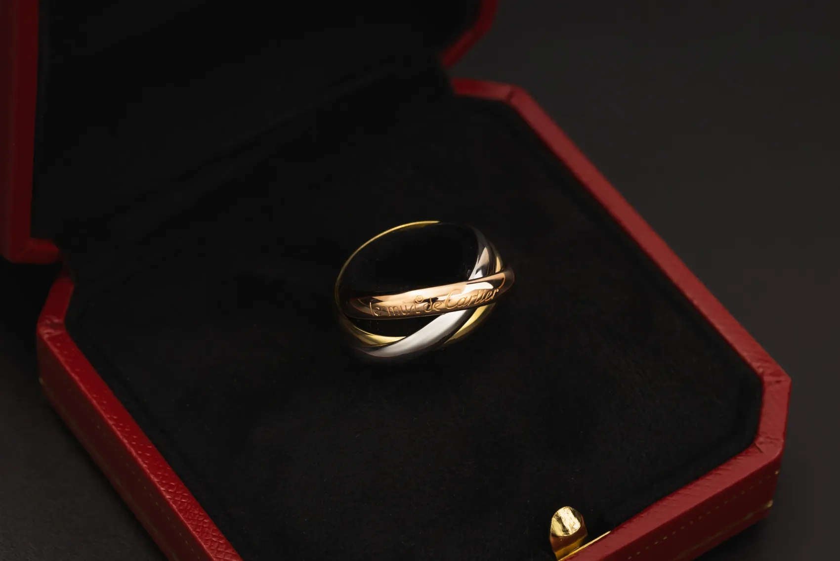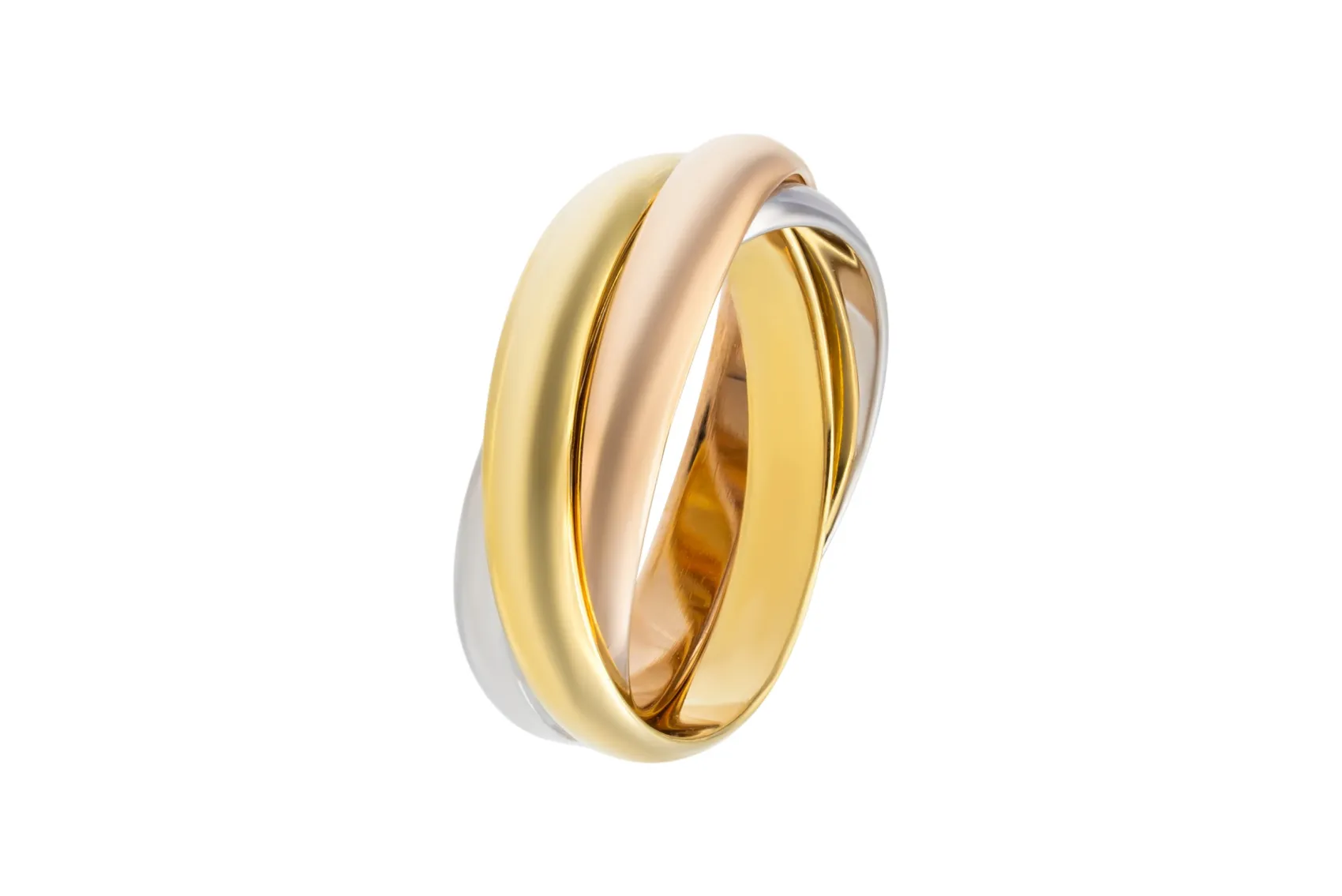 This iconic Cartier Trinity ring is crafted in 18ct yellow, white, and rose gold, featuring three intertwined moving bands that symbolise unity and timeless design.