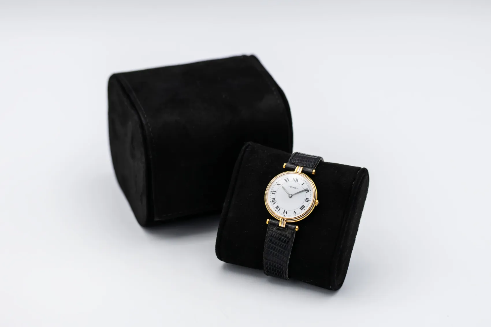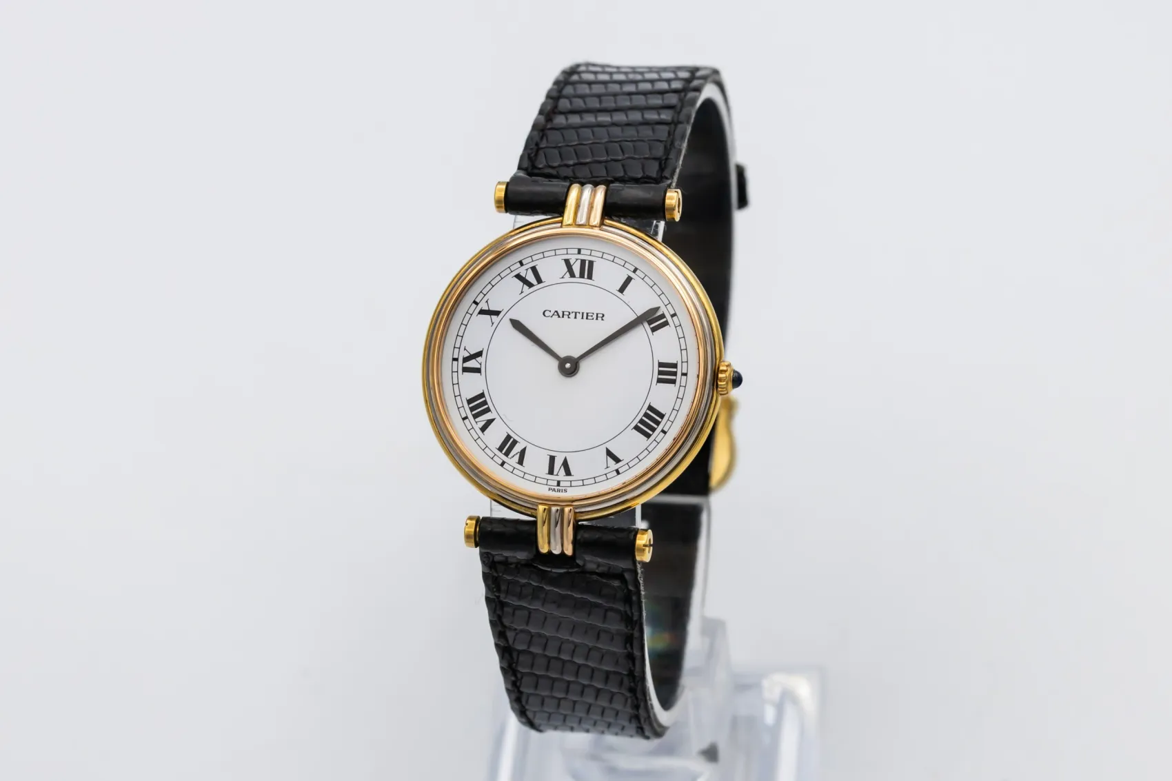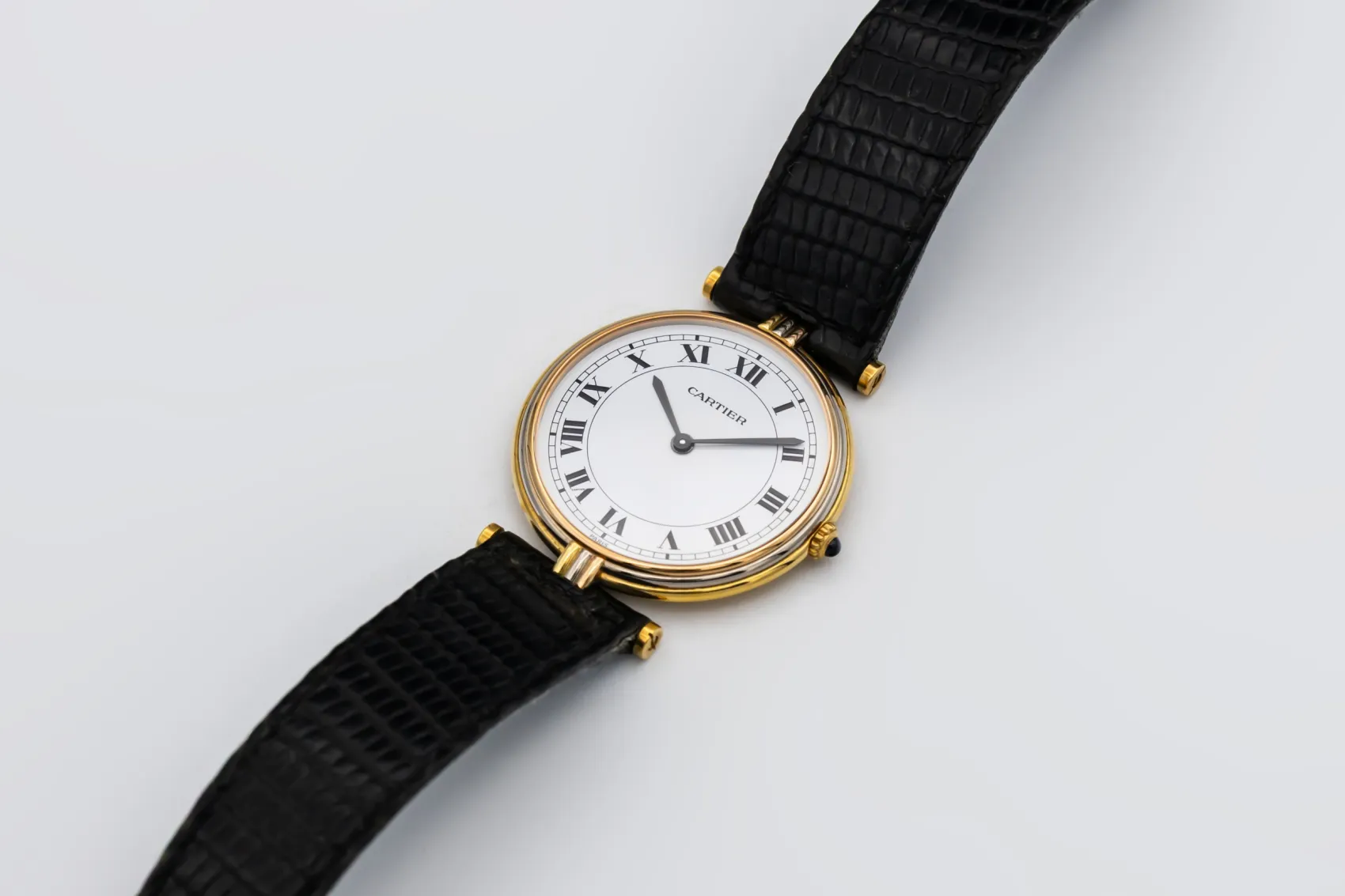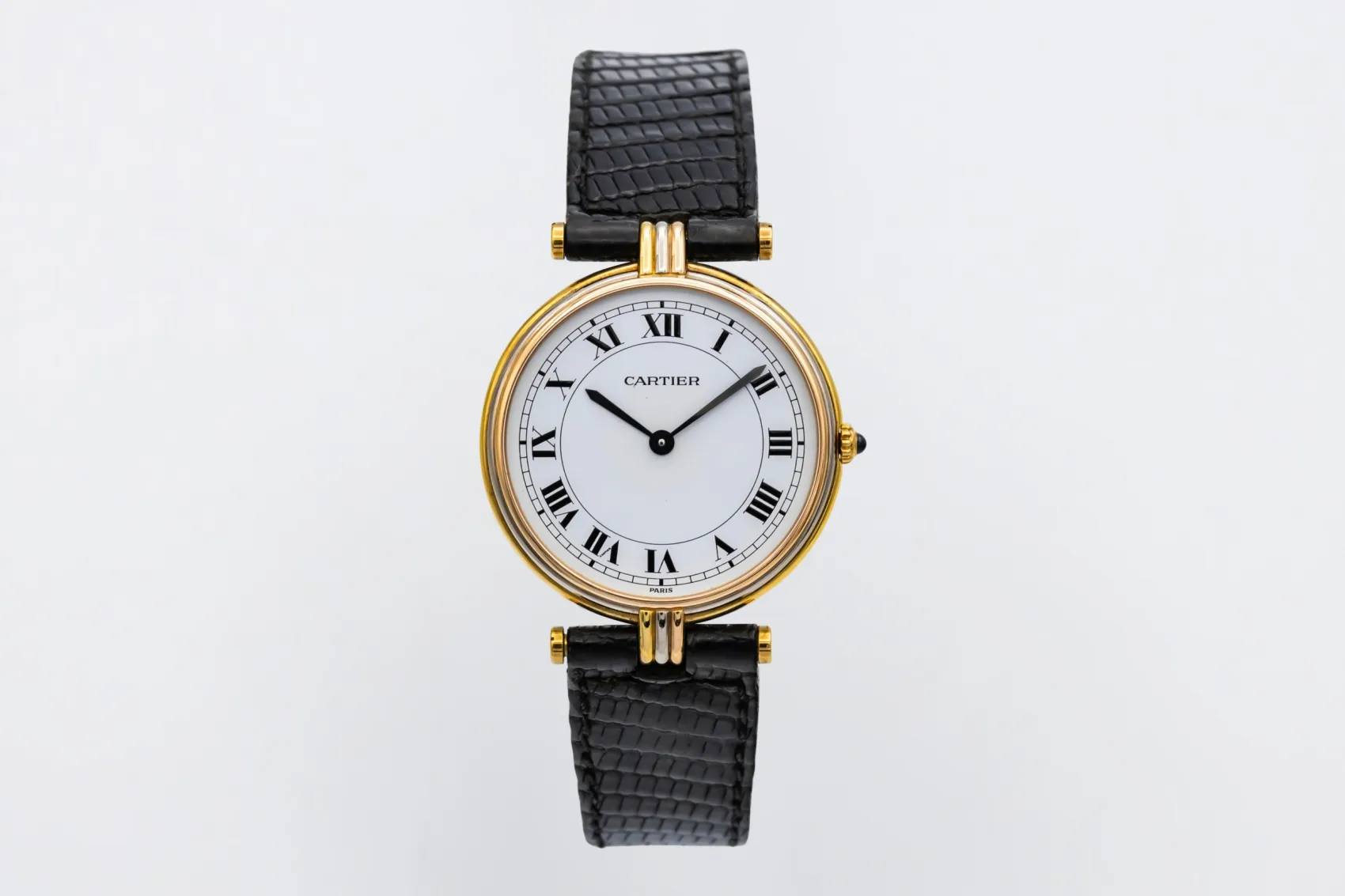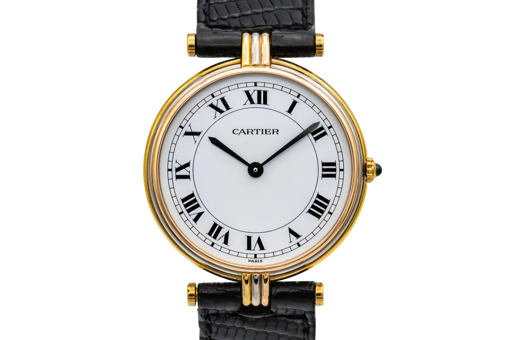 finance this from £56.2 p/m call the shop Read about our Limited Lifetime WarrantyThis circa 1990s Cartier Vendôme Tricolore is a refined vintage dress watch crafted in 18ct yellow gold. The elegant round case features the distinctive tricolore lug detailing in yellow, white, and rose gold, adding subtle contrast and signature Cartier character. The clean white dial showcases bold black Roman numeral hour markers and blued steel hands, finished on a black leather strap for timeless sophistication.