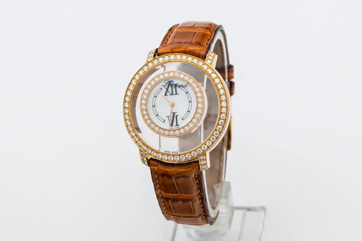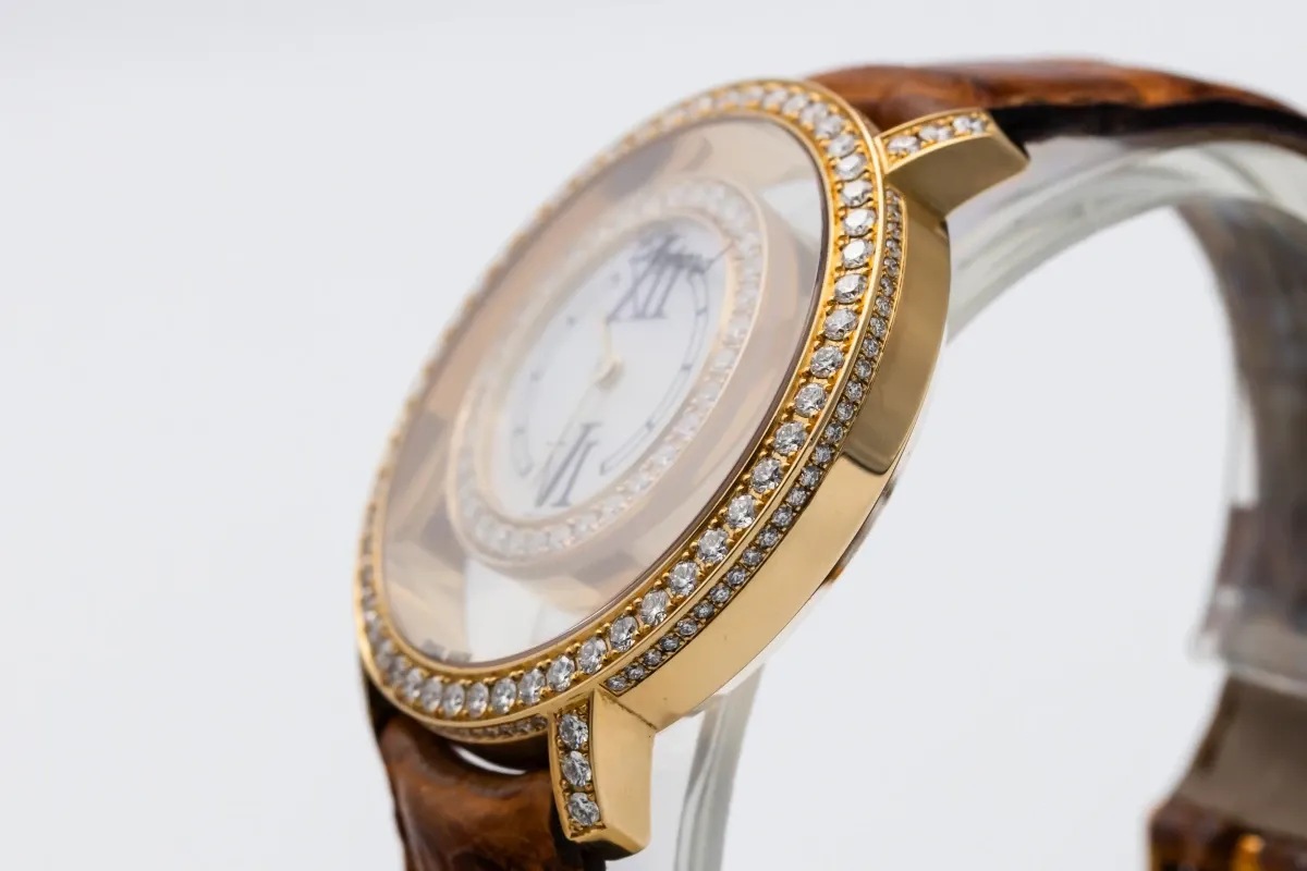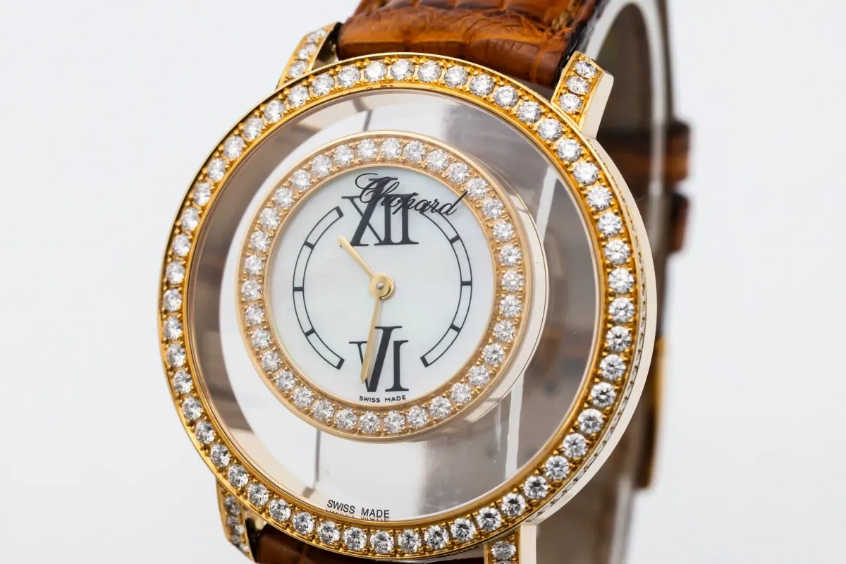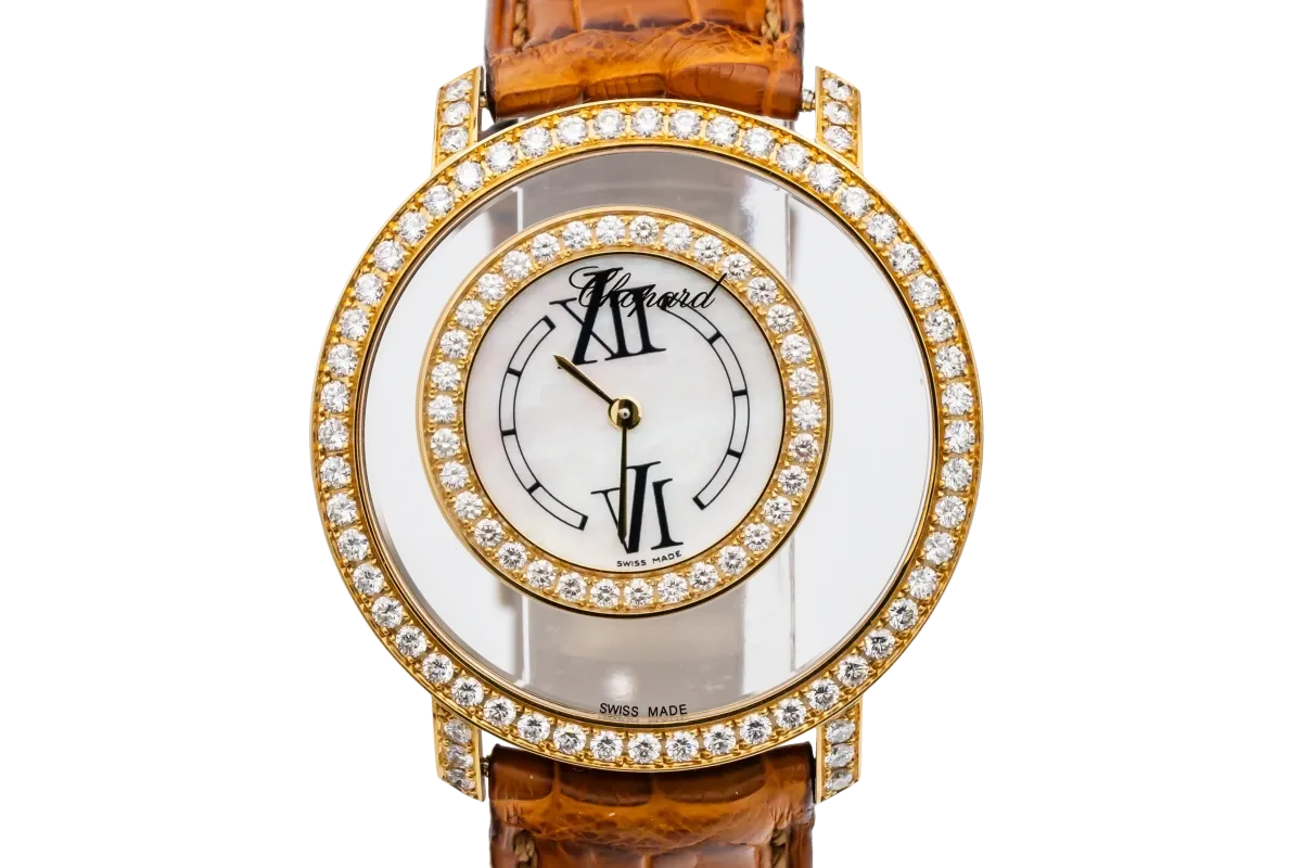 finance this from £159.86 p/m call the shop Read about our Limited Lifetime WarrantyThis Circa 2010 Chopard Happy Diamond 37mm features a mother of pearl dial with suspended roman numerals, creating a sense of floating elegance. It also features a 18ct rose gold bezel adorned with brilliant-cut diamonds, set on the bezel and lugs and a brown leather bracelet.