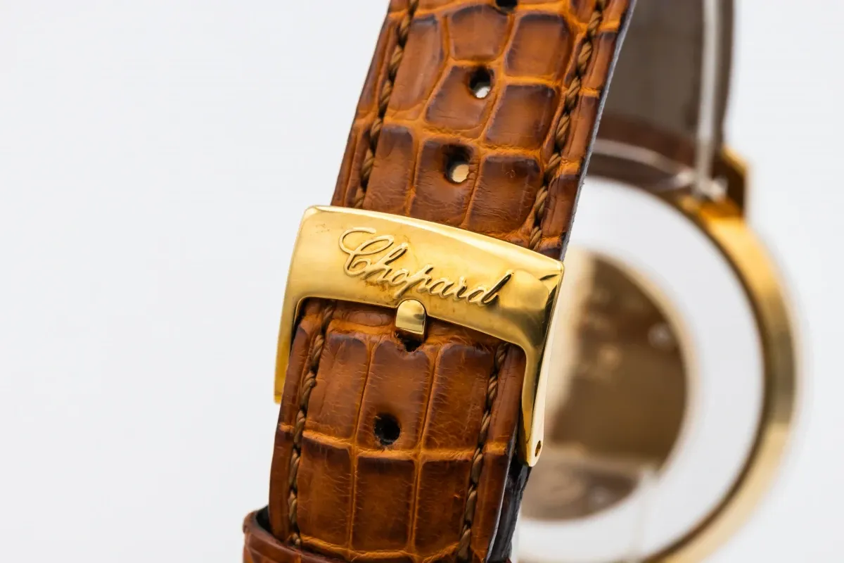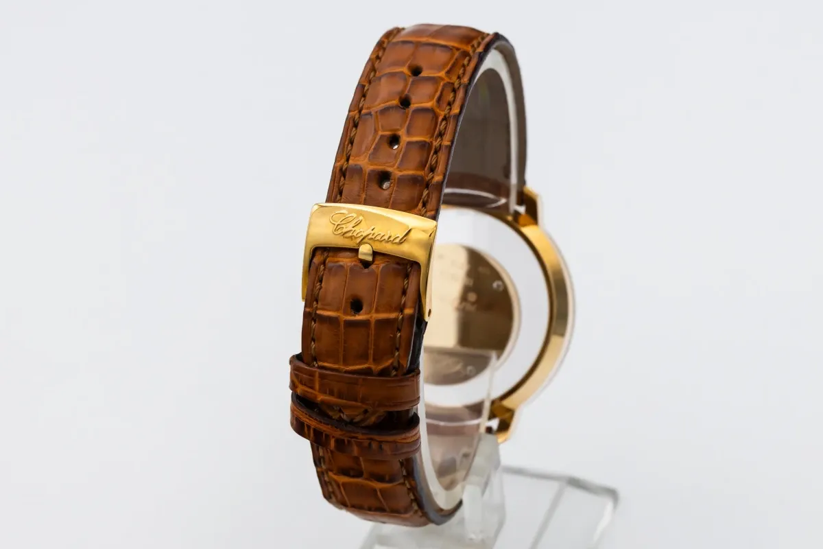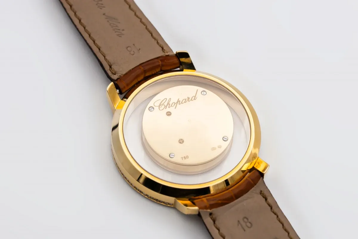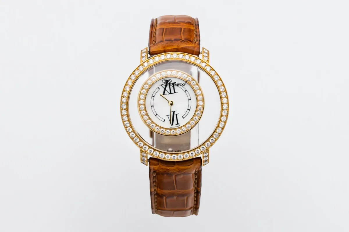 finance this from £159.86 p/m call the shop Read about our Limited Lifetime WarrantyThis Circa 2010 Chopard Happy Diamond 37mm features a mother of pearl dial with suspended roman numerals, creating a sense of floating elegance. It also features a 18ct rose gold bezel adorned with brilliant-cut diamonds, set on the bezel and lugs and a brown leather bracelet.