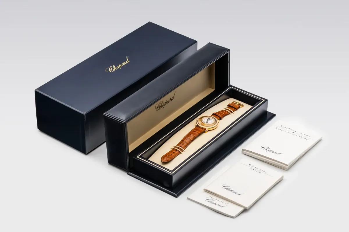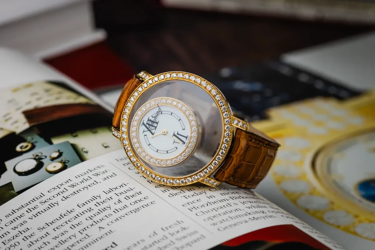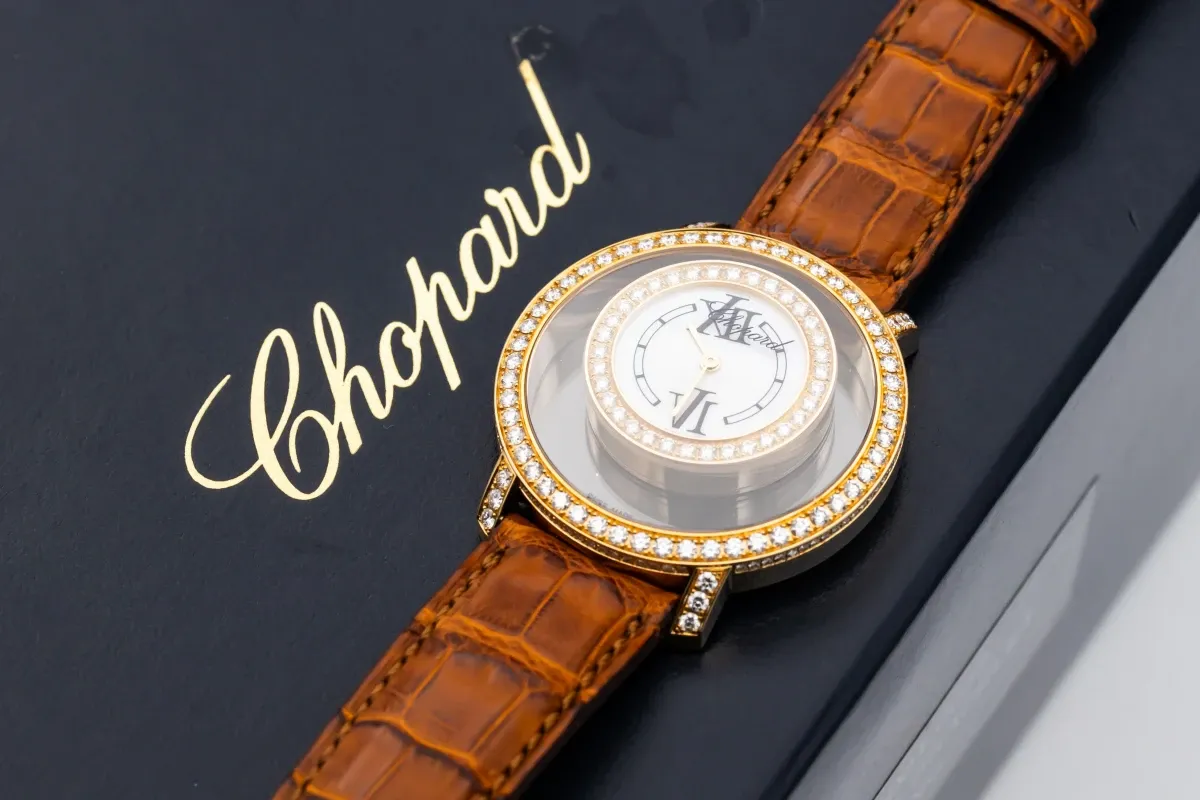 Within this iconic line, the Happy Time sub-collection (sometimes referred to as Happy Diamonds – Happy Time) includes styles that marry classic watch design with the signature floating diamonds, often emphasizing jewelry-like aesthetics—think gold cases, mother-of-pearl or guilloché dials, and lustrous straps or bracelets.
