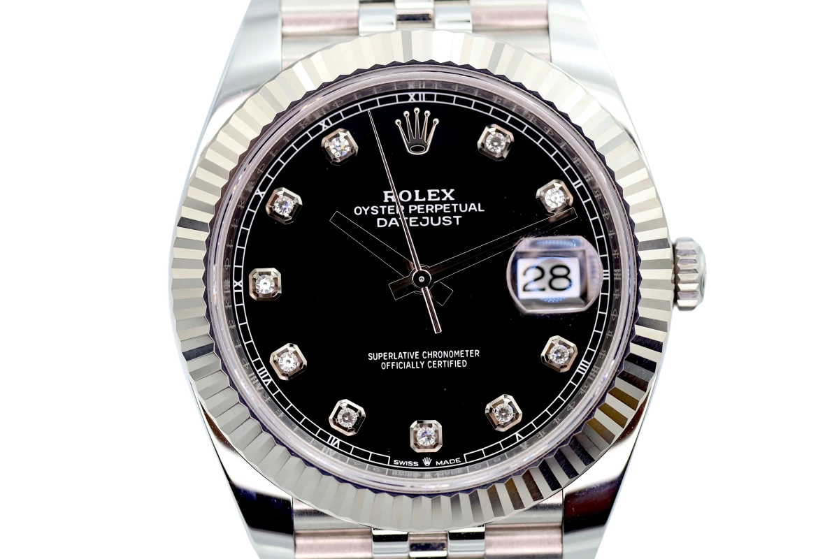 2021 Unworn Rolex Datejust 41 Stainless steel 41mm case featuring an 18ct white gold fluted bezel, Factory black 10 bit diamond dial. Jubilee multilink bracelet and a oyster comfort clasp. Ref 126334 Box & original Rolex Warranty card