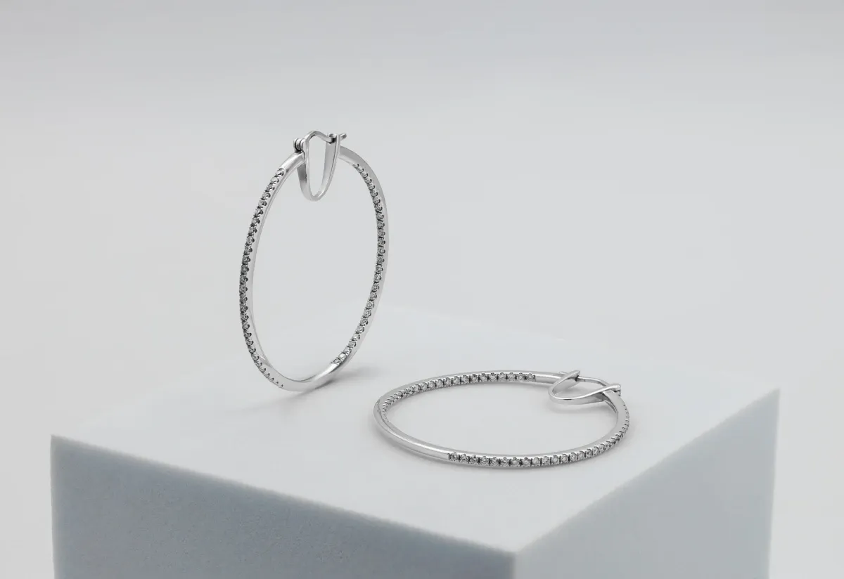 With a total diamond weight of 0.92ct, these elegant hoops offer timeless sophistication and sparkle. Crafted in premium F VS quality diamonds, they weigh 7.4g and measure 1.5mm in width.