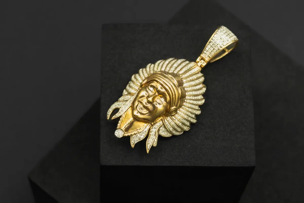 This unique 9ct yellow gold Indian head pendant is made with great detail, decorated with diamonds.