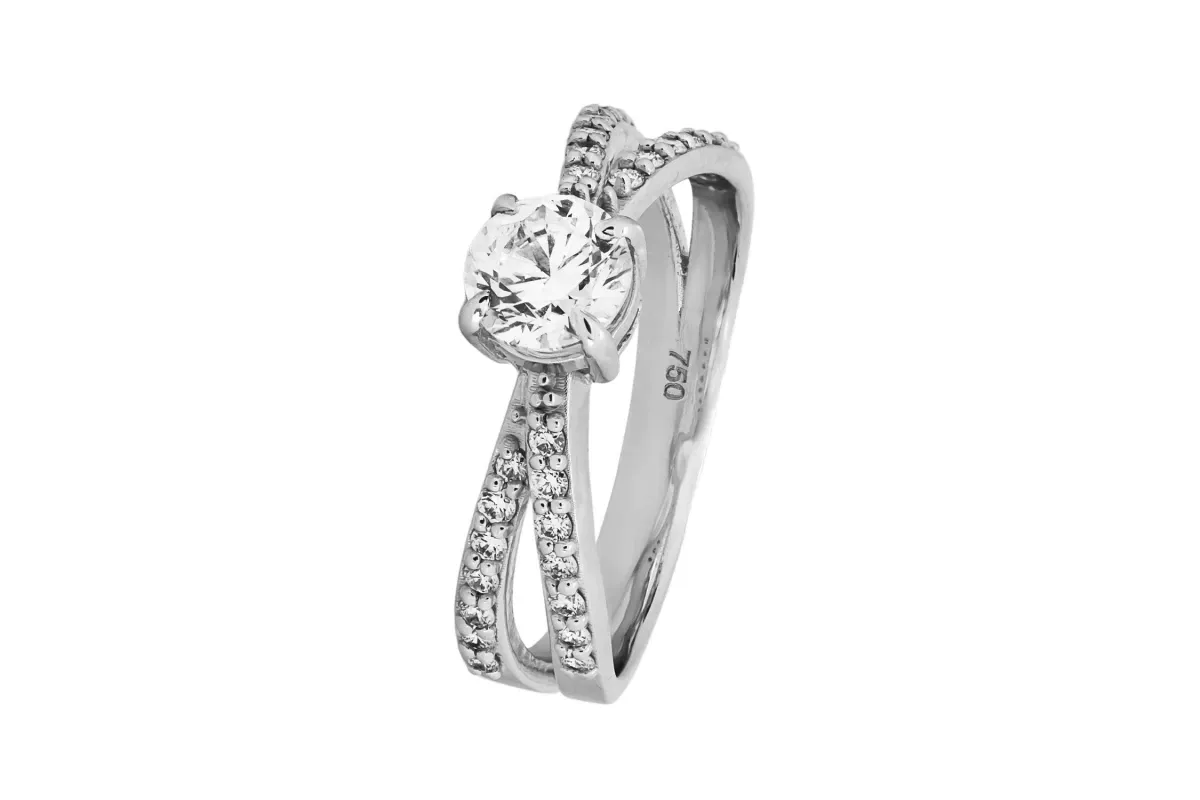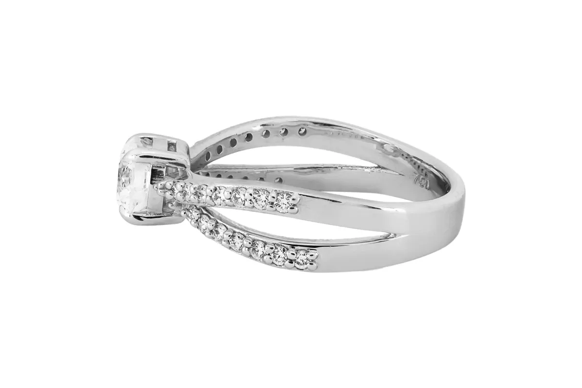A 18ct white gold split shank diamond engagement ring featuring a round brilliant center diamond with 28 round brilliant diamonds on the shoulders.