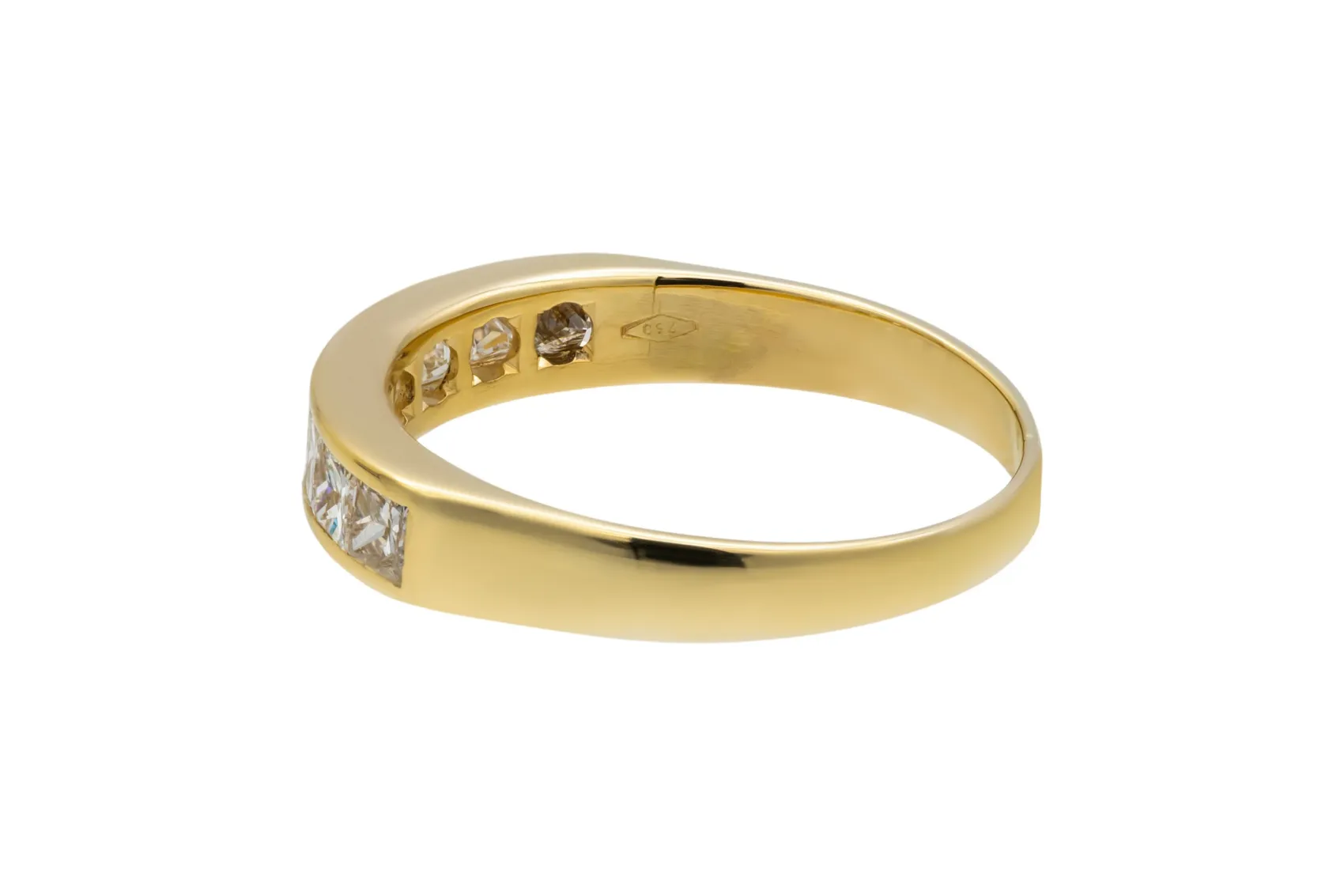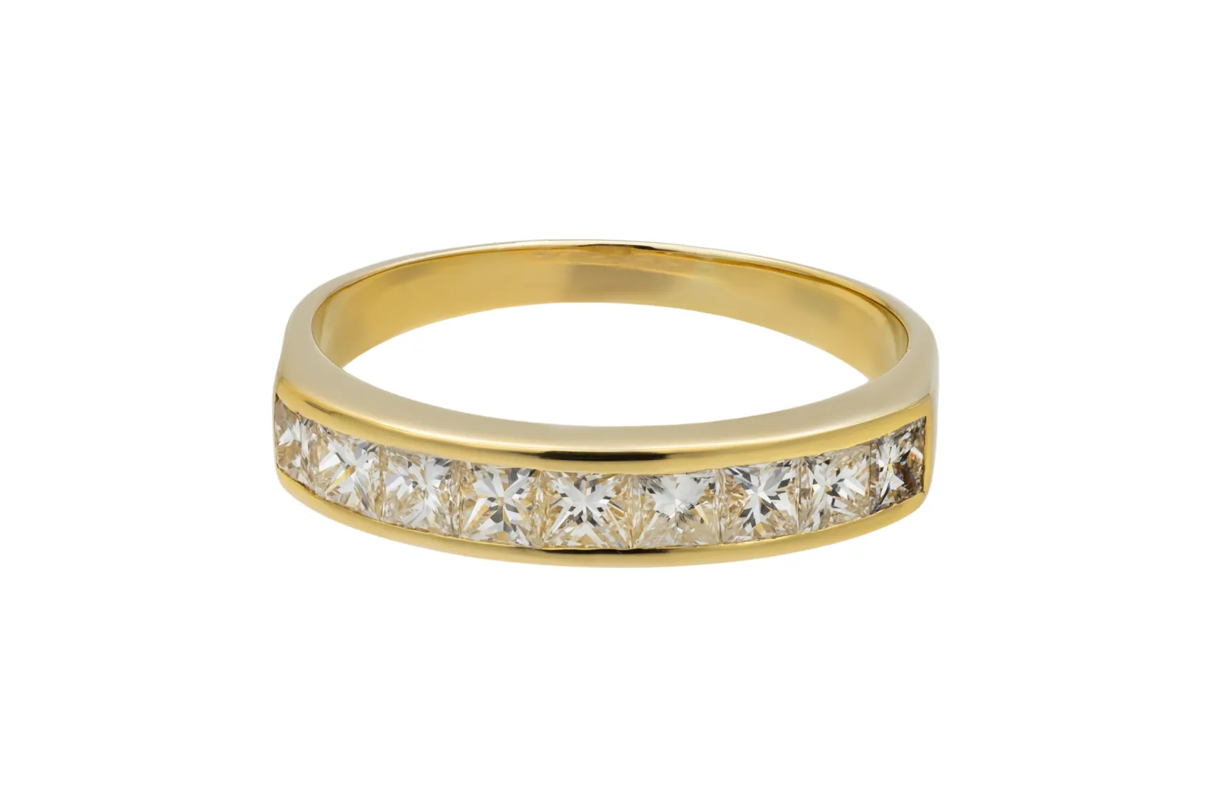Crafted in 18ct yellow gold, this channel set eternity wedding band features princess cut diamonds totalling 1.00 carat.
