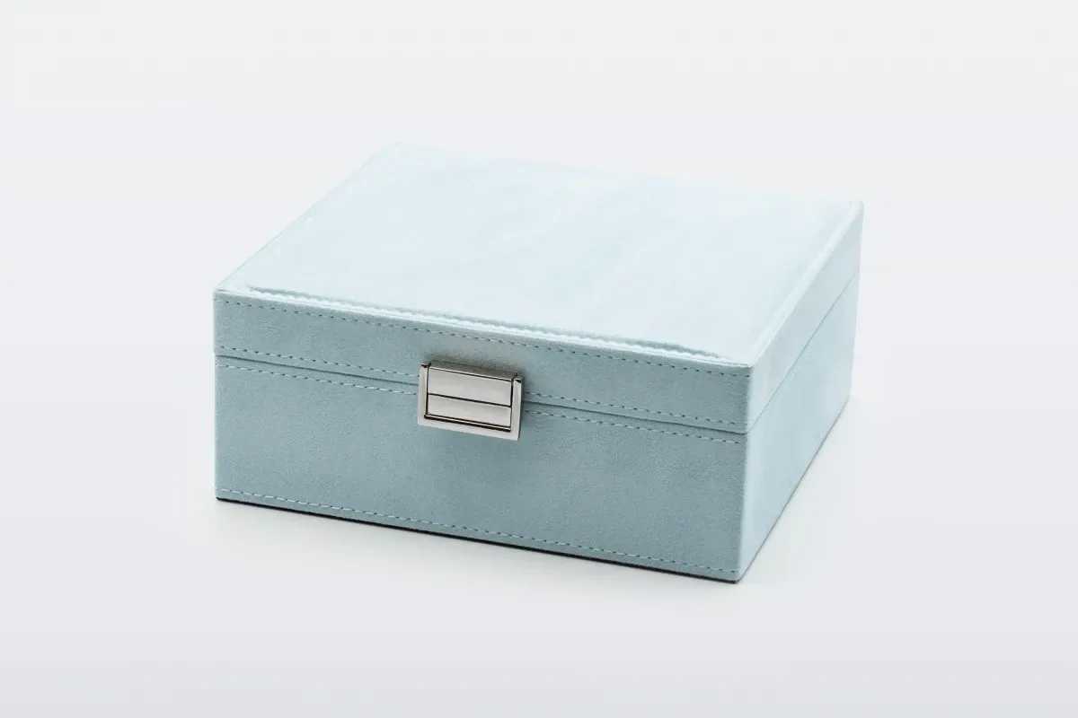 Our travel case is a versatile and stylish option for all your on-the-go storage needs. It is expertly crafted in a sleek sky blue velvet material, providing a luxurious and sophisticated look. The material is soft to the touch and adds a sense of elegance to the case.