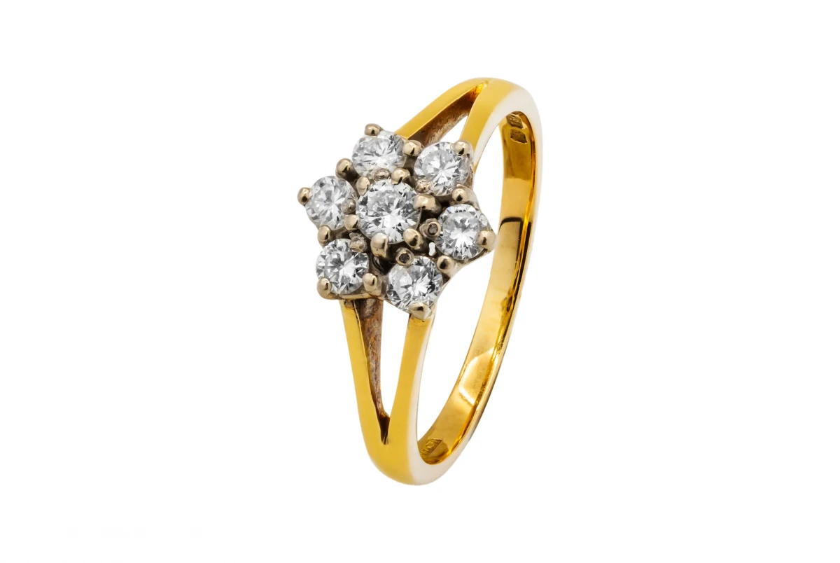 Crafted in 14ct yellow gold, this elegant ring features a flower-shaped cluster of diamonds forming a radiant centrepiece. With approximately 1 carat of diamonds, the delicate floral design creates a feminine and eye-catching sparkle.
