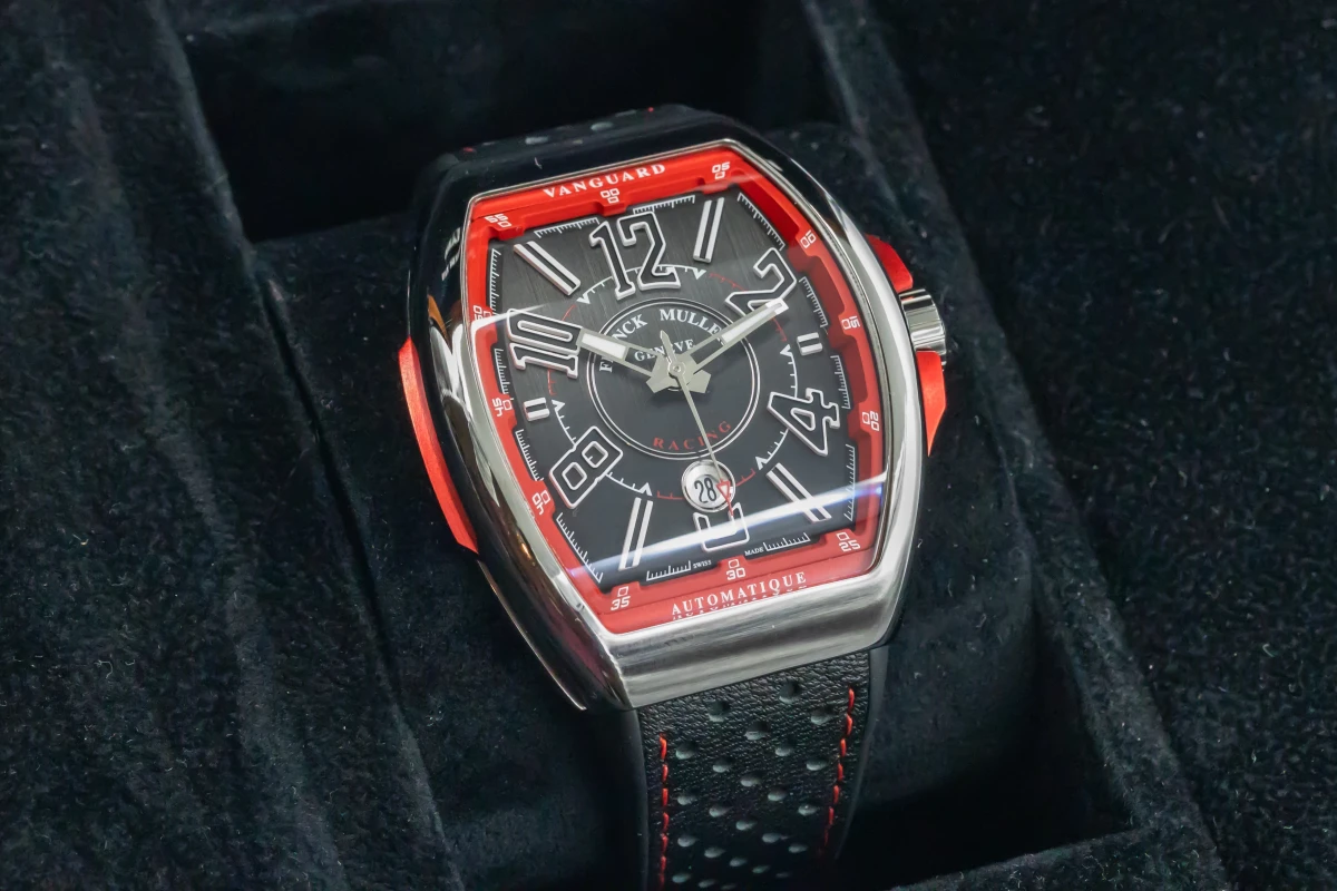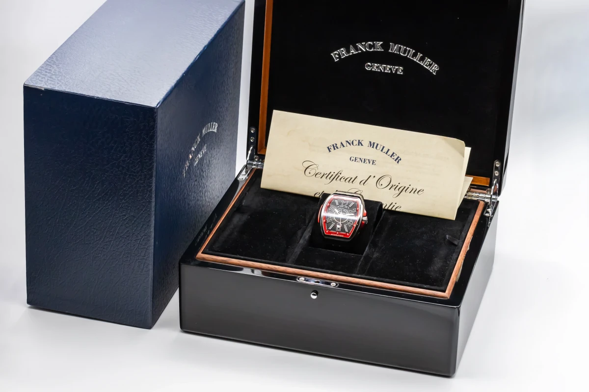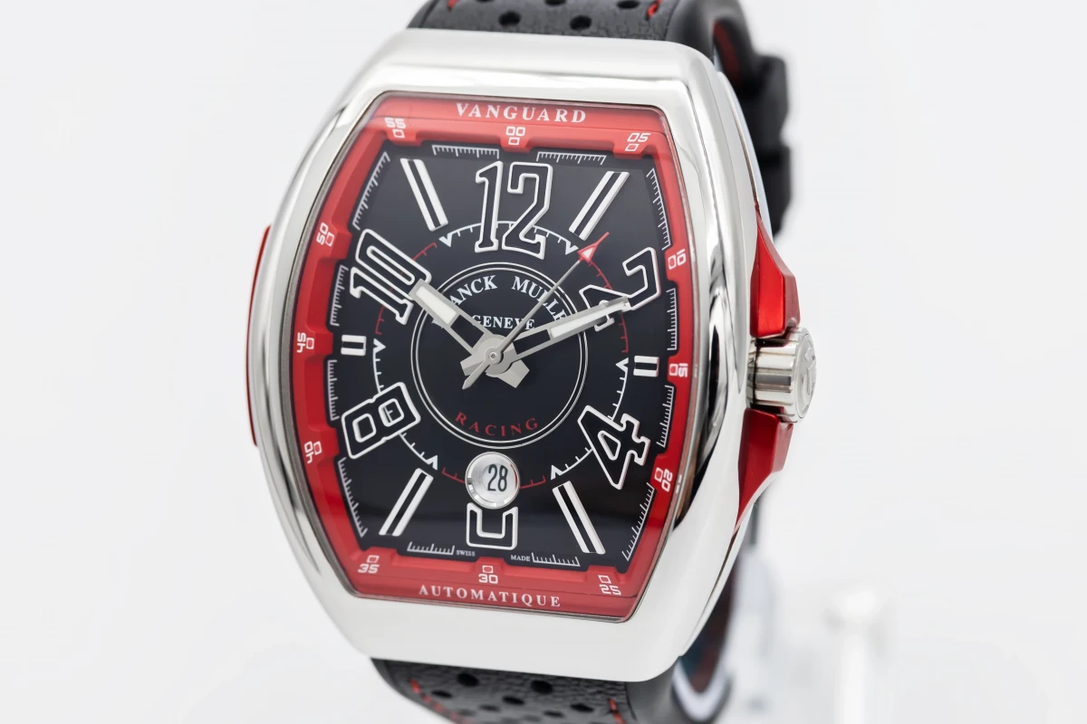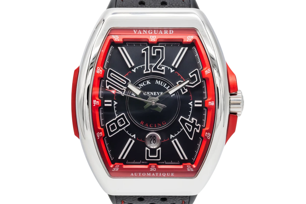 This 2023 Franck Muller Vanguard 44mm features a black dial with quarter arabic numerals and a black leather bracelet. It also features a smooth stainless steel bezel.