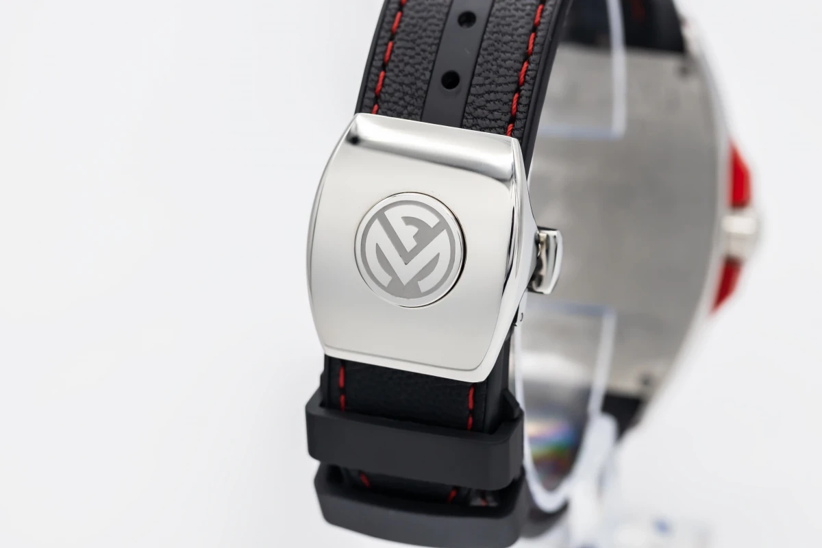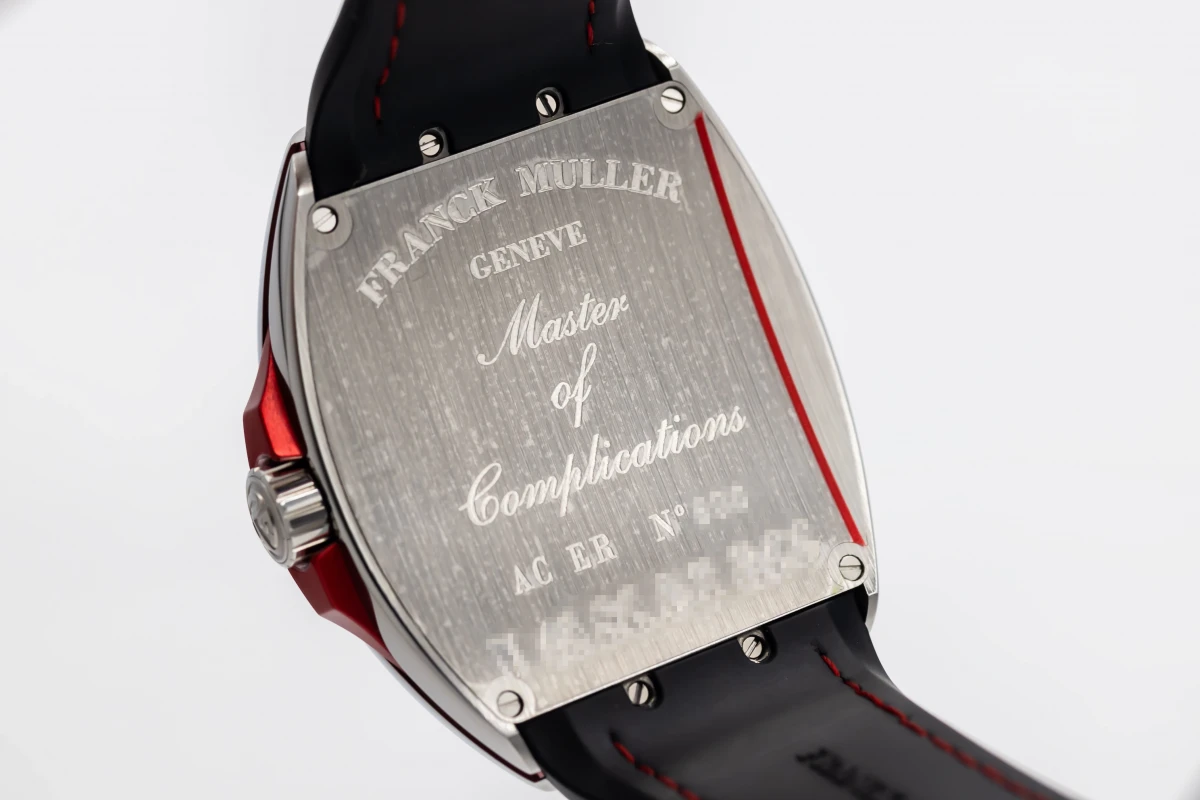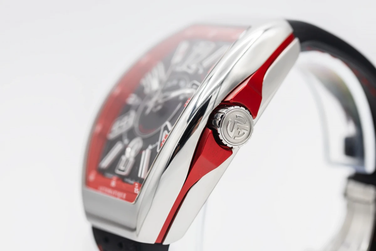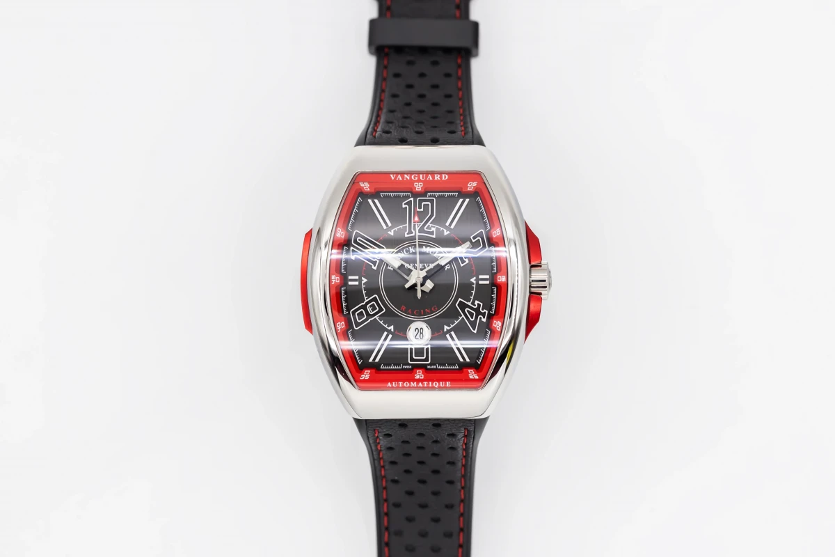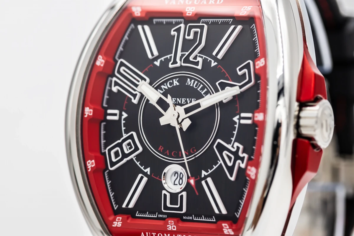 This 2023 Franck Muller Vanguard 44mm features a black dial with quarter arabic numerals and a black leather bracelet. It also features a smooth stainless steel bezel.