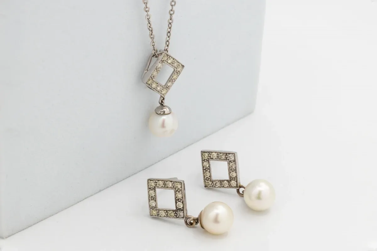 This exquisite set features fresh water pearls paired with 0.72ct of diamonds graded H Si1 in 18ct white gold