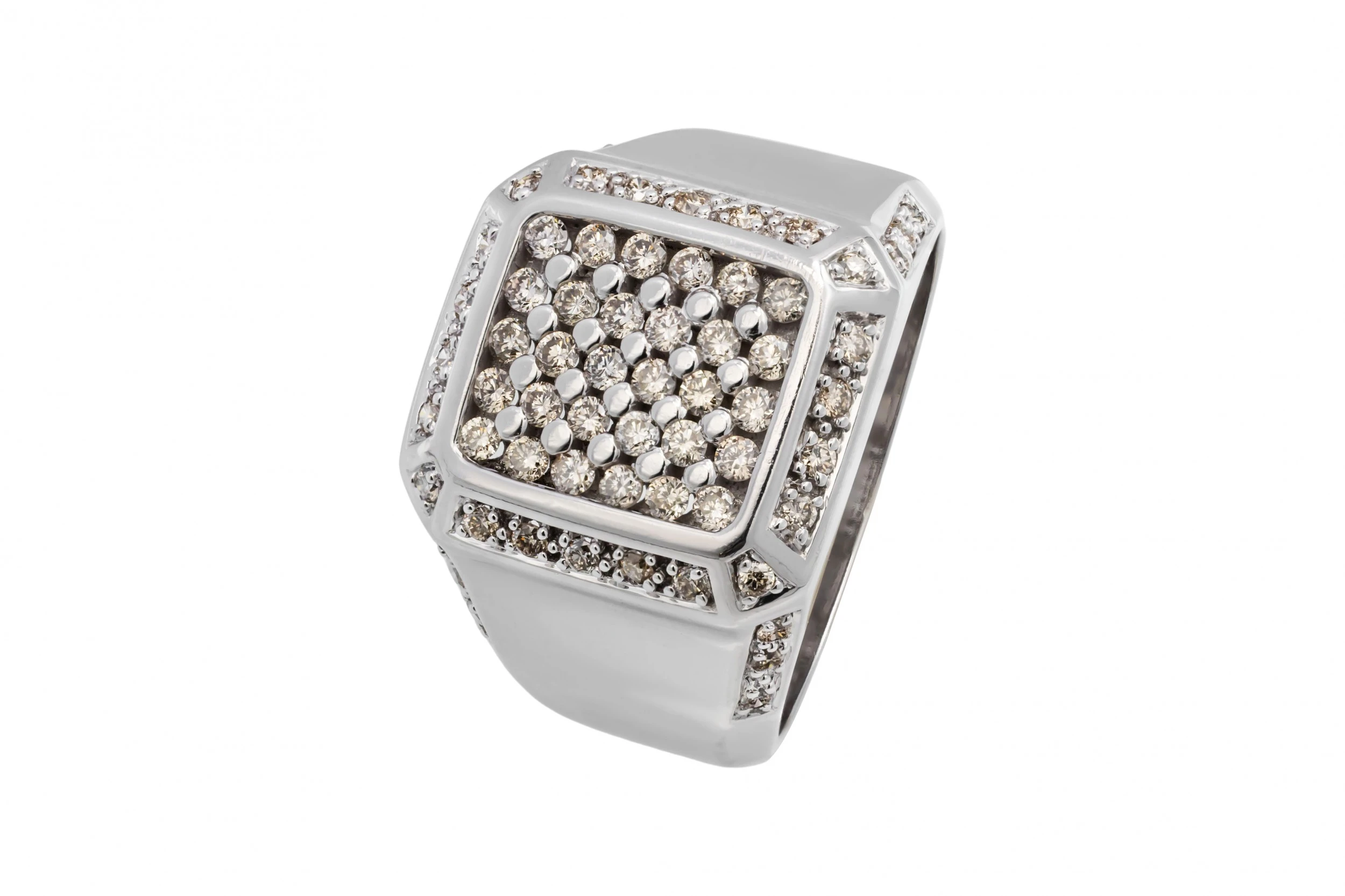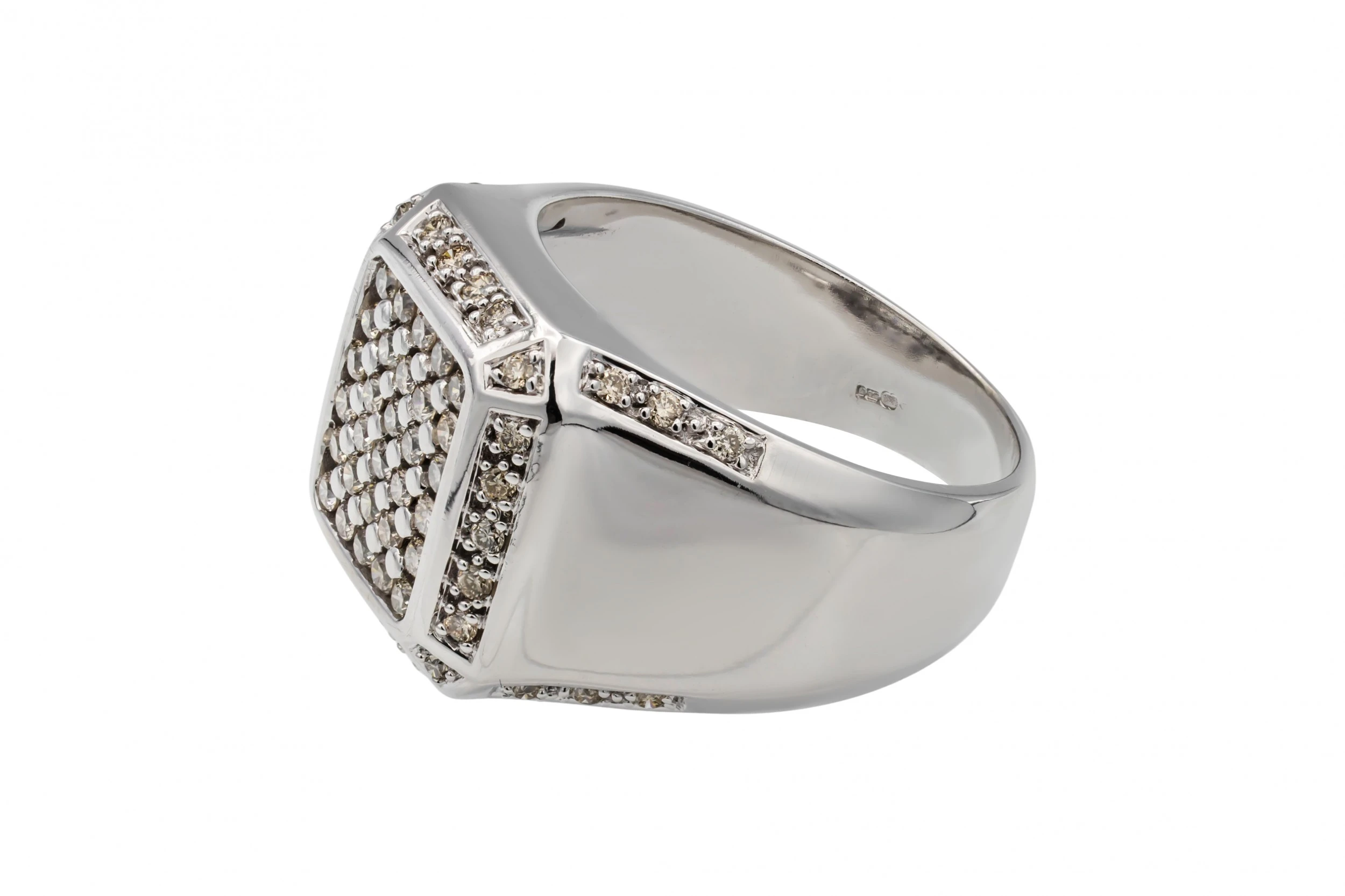 This bold 9ct white gold men’s ring is set with a full 1.00ct of round brilliant cut diamonds, graded G colour with SI clarity for strong, eye-catching sparkle.