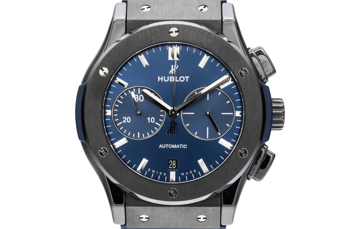 This 2018 Hublot Classic Fusion Chronograph 45mm features a blue dial with baton indexes and a blue lined rubber strap. It features a vertical satin finished titanium bezel with 6 H-shaped titanium screws.