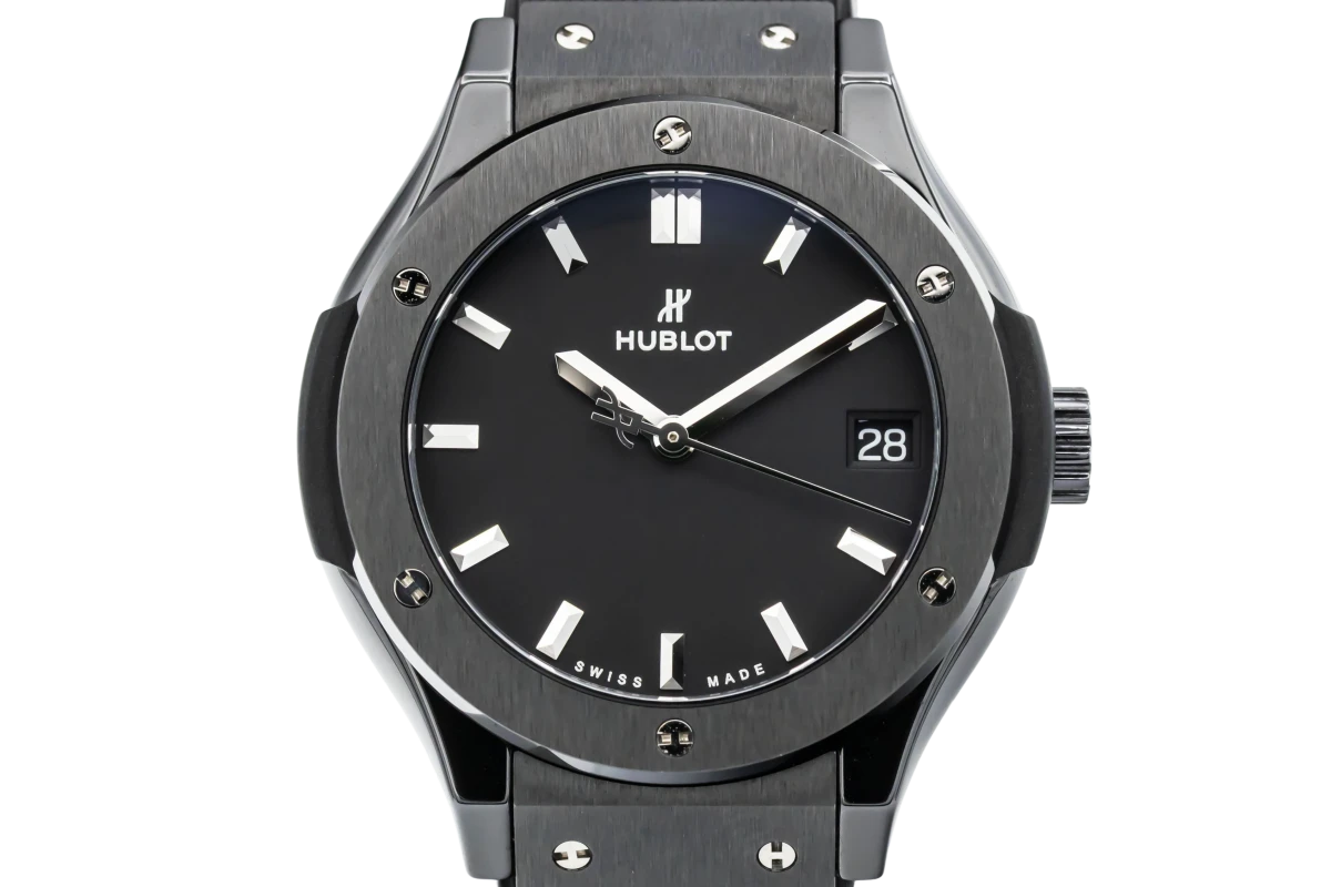 This 2020 Hublot Classic Fusion 33mm features a black dial with baton markers and a black rubber strap with steel deployment clasp. It also features a polished bezel with 6 H-shaped titanium screws.