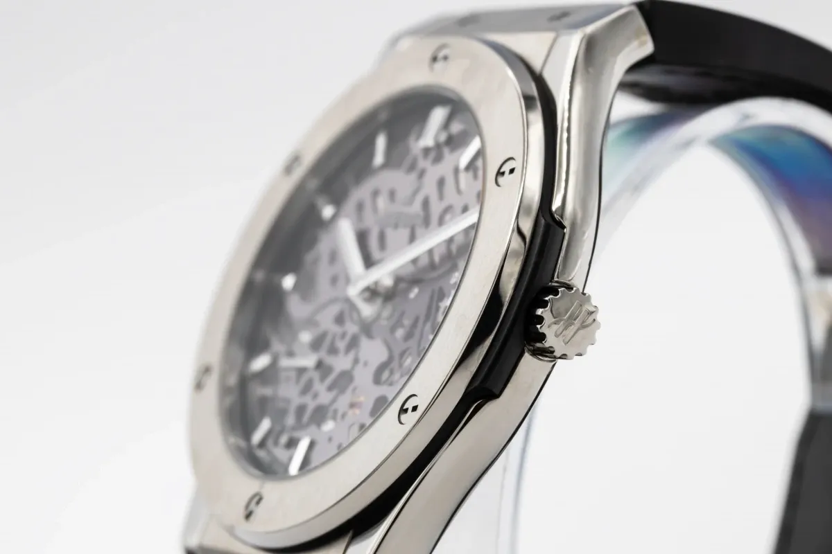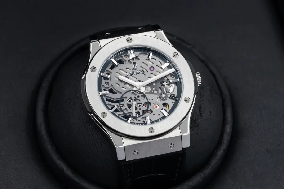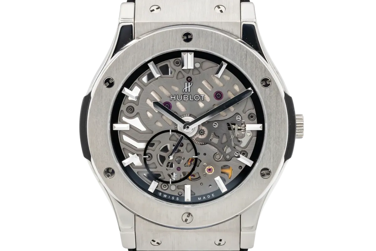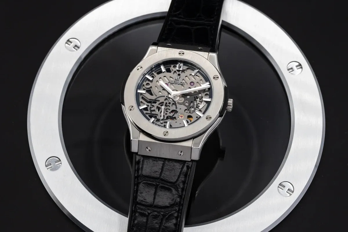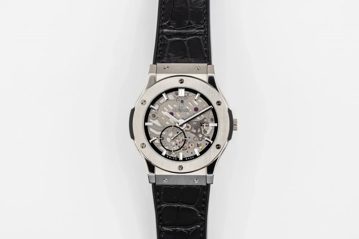finance this from £130.6 p/m call the shop Read about our Limited Lifetime WarrantyThis 2017 Hublot Classic Fusion 45mm features a skeleton dial with a black leather bracelet. It features a vertical satin finished titanium with 6 H-shaped titanium screws.